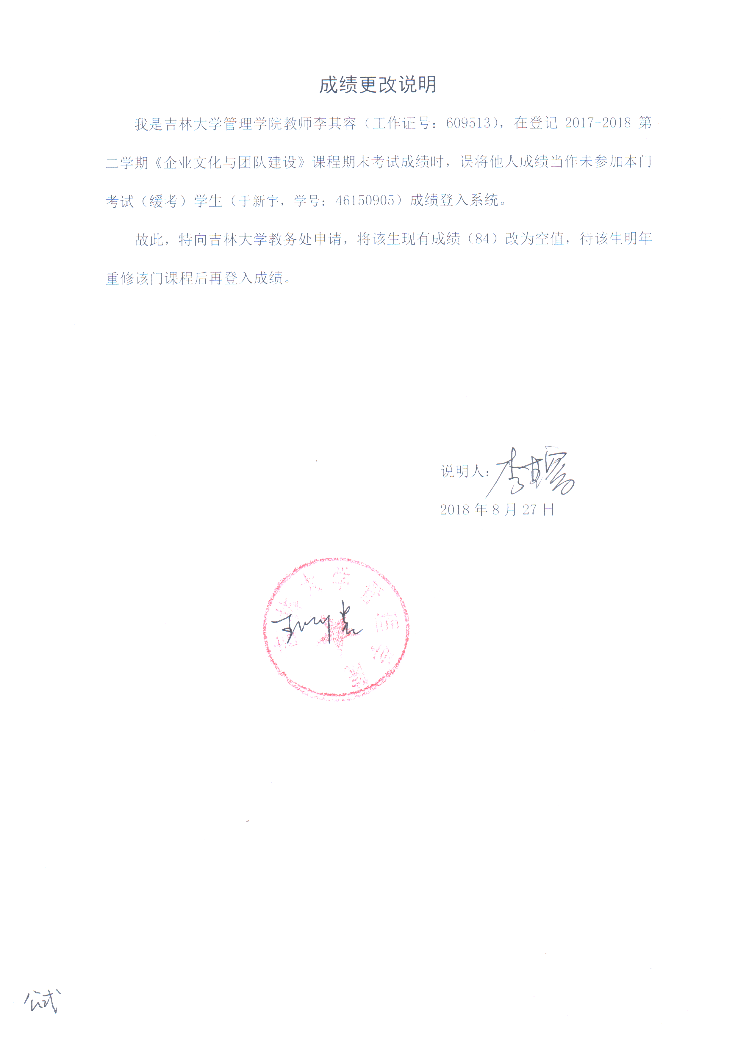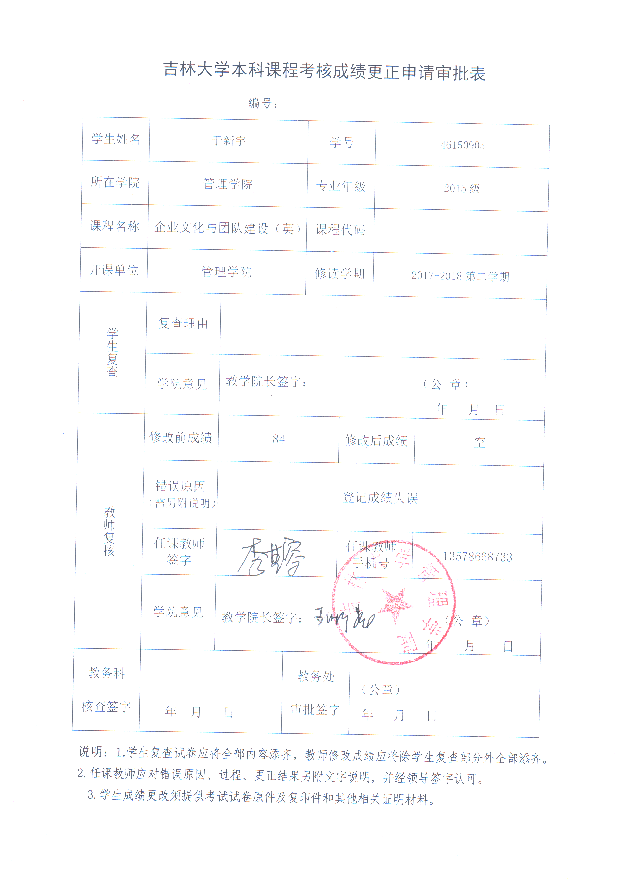 根据《关于进一步明确本科生课程考核等有关问题的通知》(校教字[2018]47号)文件有关精神,现对管理学院2015级于新宇同学(46150905)2017-2018-2《探花视频-探花视频最新官方直达页与团队建设(英)》成绩更正如下: