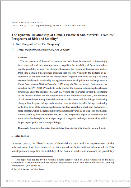 吉林大学商学与管理学院刘柏教授等在《中国社会科学(英文版)》2022年第2期发表题为“The Dynamic Relationship of China’s Financial Sub-Markets: From the Perspective of Risk and Stability”(中国金融子市场的动态关系:基于风险和稳定的视角)的文章。