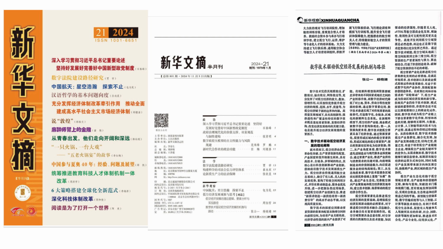 近日,吉林大学商学与管理学院张公一教授与博士生杨晓婧的学术论文《数字技术驱动低空经济发展的机制与路径》被新华文摘2024年第21期全文转载。文章旨在探讨高质量发展视域下数字技术驱动低空经济发展的理论阐释、作用机制与实现路径,为提升数字技术驱动低空经济高质量发展的效能提供启示。