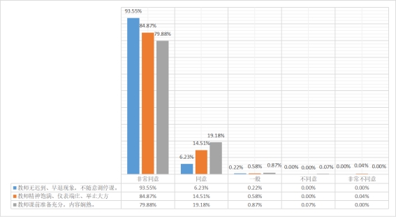 根据督导专家和学院提交的评课记录数据统计,教学态度方面评价较高,教师能够做到守时守规,不随意调停课,上课精神饱满,课前准备充分,授课娴熟,教案、教具完备。教师良好的教学态度能很好地提升学生的学习积极性和学习效果,提高课堂教学效率。