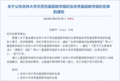 基层教学组织是落实教学任务的最基本单位,是教师之间研究教学问题、交流教学经验、改革教学方法、开展教学研究的学习共同体,是提高教学质量、促进教师发展、推进人才培养模式创新和深化教学改革的基本单元和组织保证。为进一步焕发基层教学组织活力,学校遴选建设了一批示范性基层教学组织,强化有组织教学,全面提升教师教书育人能力,充分发挥基层教学组织在教学中的关键作用。经学院推荐、学校评审及校内公示,确定“生物学基础实验课程教研室”等10个基层教学组织为吉林大学示范性基层教学组织;确定“《西方文论原典导读》‘课程云’团队”等47个基层教学组织为吉林大学优秀基层教学组织。