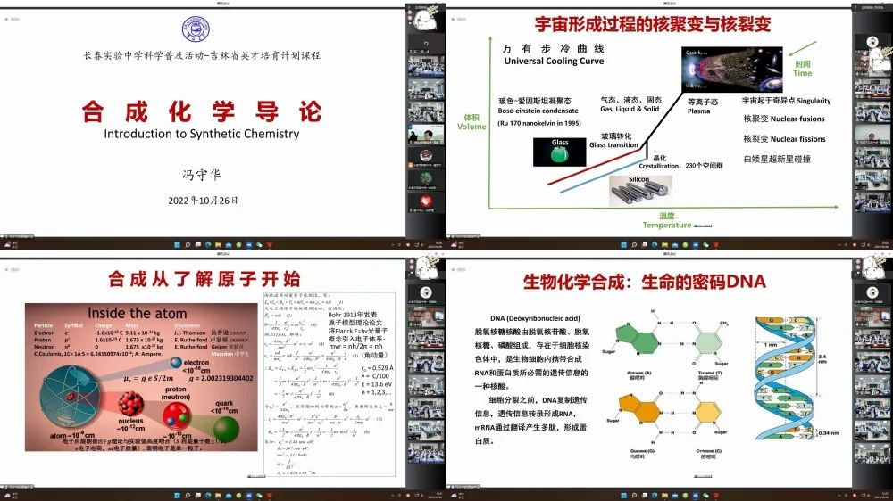 为进一步提升“英才计划”学生选拔和培养质量,落实中共中央办公厅、国务院《关于新时代进一步加强科学技术普及工作的意见》的文件精神,10月26日“院士科普进校园——暨长春市实验中学英才计划前置培养活动”在云端举行。本次活动邀请到了中国科学院院士、吉林大学校学术委员会主任、英才计划化学学科导师冯守华,为长春市实验中学师生作报告。吉林大学化学学院副院长郭玉鹏、教务处副处长陈铎、教务处合作培养科崔冰一、吉林省青少年科技中心孙梦雪、长春市实验中学党政领导参会,活动由市实验中学李伟红副校长主持。