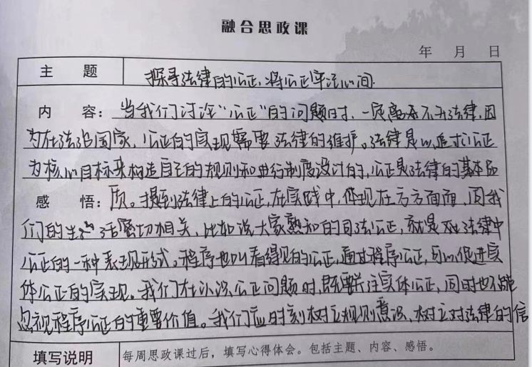 学生们都听得很认真,边听边做笔记,对法律和公正有了更多的理解,并记录了学习感悟。