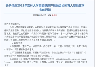 开展2022年吉林大学智能基座产教融合协同育人基地奖学金评选工作。吉林大学与华为技术有限公司共同设立吉林大学智能基座产教融合协同育人基地奖学金,深化信息技术领域人才培养模式改革和协同创新,激发学生应用鲲鹏、昇腾和华为云技术的学习热情。