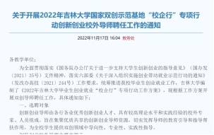 发布《关于开展2022年吉林大学国家双创示范基地“校企行”专项行动创新创业校外导师聘任工作的通知》。