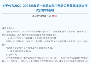 发布《关于公布2022-2023学年第一学期本科生部分公共基础课期末考试安排的通知》。