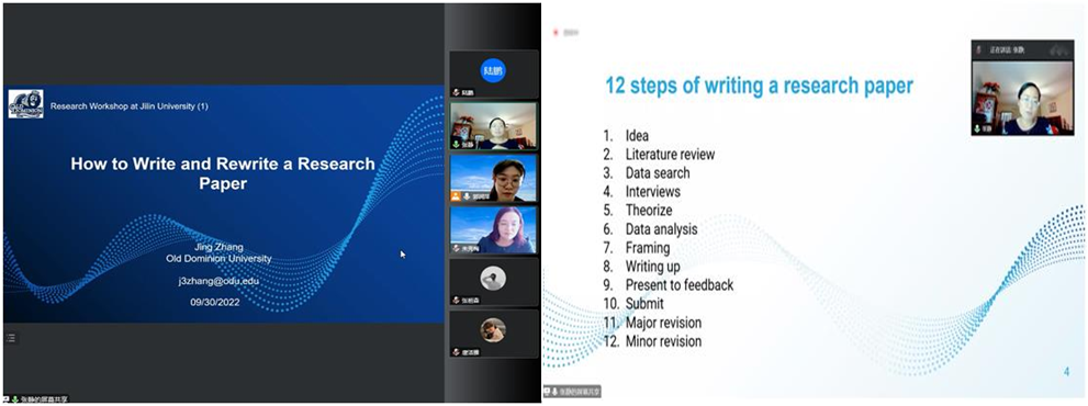 2022年9月30日上午,吉林大学商学与管理学院海外学者系列讲座第八场成功举办。本次讲座通过腾讯会议以线上形式进行,由商学与管理学院技术经济及管理系承办,主讲人为美国欧道明大学(Old Dominion University)斯特罗姆商学院管理与创业系张静副教授,讲座由技术经济及管理系副主任郭润萍副教授主持,技术经济及管理系主任朱秀梅教授及部分学院师生参与了本次学术交流。