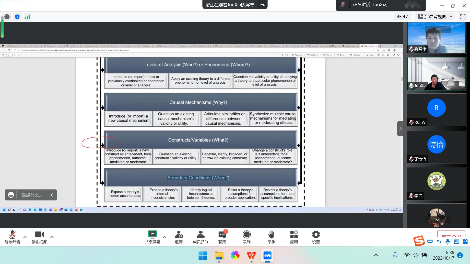 第一场讲座题为“Two-way interactions and quadratic interactions”。讲座开始,夏军教授首先提出了一个问题:Interactions是Empirical还是Theoretical?基于这个问题,夏教授通过讲解Colquitt(2007)文章中提到的两种贡献方式为本次讲座做铺垫,即理论构建(Theory Building)和理论检验(Theory Testing),并简要介绍了顶刊对于两种贡献的倾向。接着,夏教授介绍了从理论上考虑,文章写作的三种方式,即归纳 (Induction)和推理(Deduction)以及溯因(Abduction)的区别、形式逻辑和辩证逻辑的区别。根据夏教授的经验,他认为基于现有理论提出新的构念(New Construct)、新机制(New Mediator or Moderator)会使研究更有意义。最后,夏教授分享了多篇文章,讲解了如果判断一个变量是否为调节变量,以及在实践中如何提出含有调节变量的假设及其检验。讲座过程中,夏军教授与师生充分互动,结合师生提出的问题进行耐心解答。