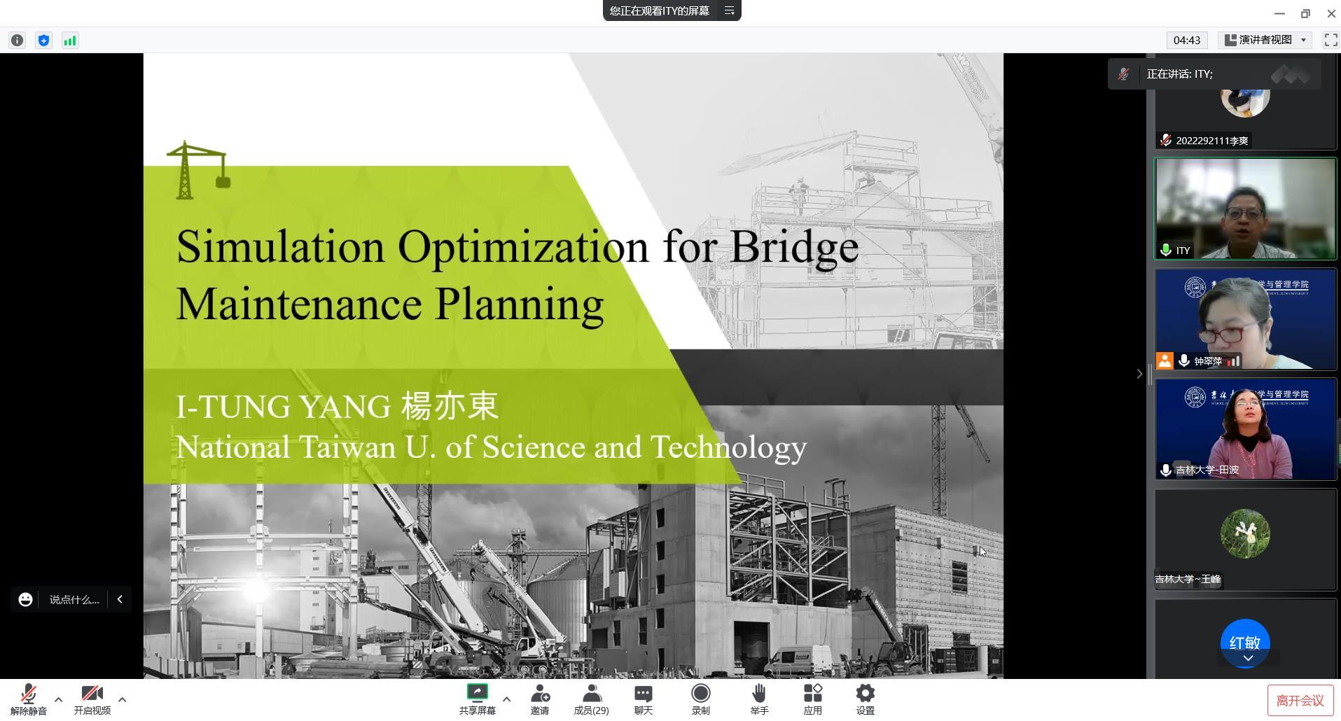 2022年10月28日下午,学院邀请到了来自台湾科技大学营建工程系的杨亦东教授作主题为《Simulation Optimization for Bridge Maintenance Planning》的线上学术报告。本次会议由吉林大学商学与管理学院钟翠萍教授主持,商学与管理学院工程项目管理系的师生共同参加了此次报告。杨亦东教授毕业于美国密西根大学安娜堡校区,多年深耕于工程管理、计算智慧、决策与风险分析以及离散事件模拟研究领域。目前,杨教授担任韩国土木工程学会学刊副总编辑、中华台北亚太工程师暨国际工程师监督委员会主任委员、中国土木水利工程学会信息委员会主任委员、国家科学及技术委员会土木工程学门审查委员,以及逾40本国际期刊审稿委员。