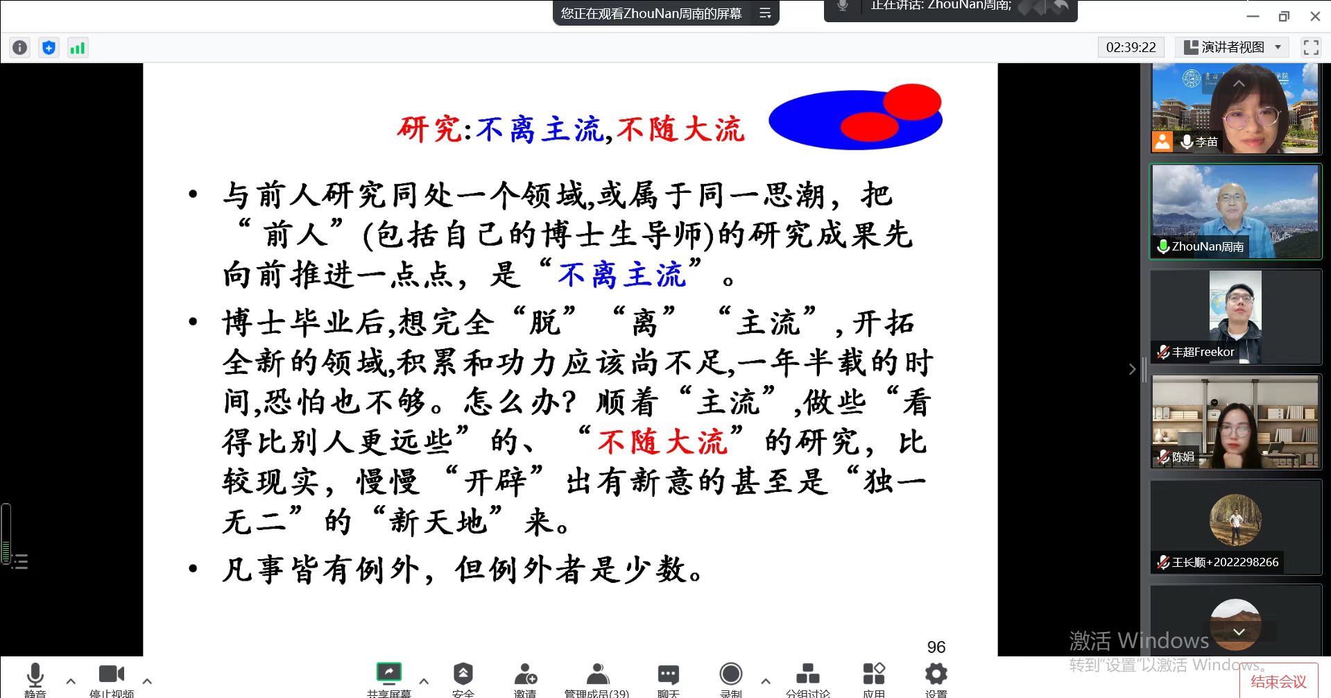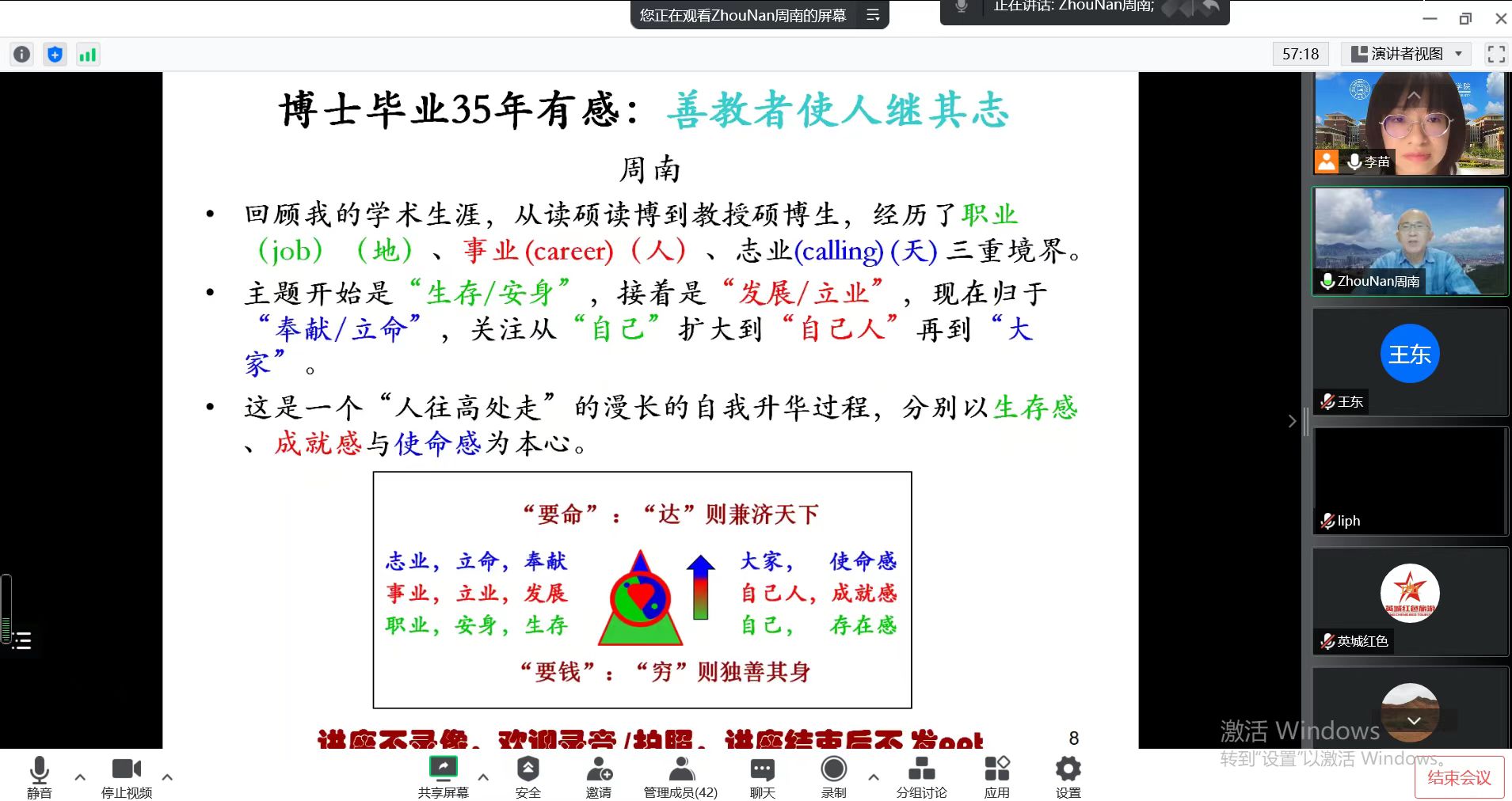 在本次报告中,周教授周老师回顾自己的学术生涯,从读硕读博到教授硕博生,经历了职业、事业、志业三重境界。主题从“生存/安身”,到“发展/立业”,现在归于“奉献/立命”,讲述“人往高处走”的漫长的自我升华过程。讲座对师生们思考自己的事业与人生有深刻启示。