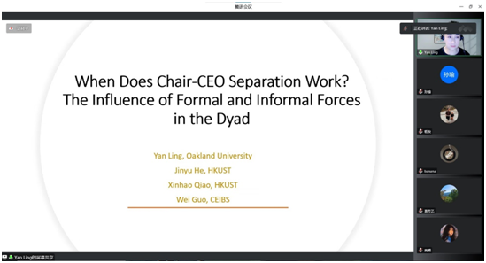 首先,凌雁老师和与会者们分享了目前她的研究领域,集中于高层管理和公司治理。凌雁老师就Chair和CEO职位角色分开的背景开始谈起,探讨了在公司内如何使两者合作更好的问题,凌雁老师详细介绍了文章的理论模型、研究假设和实证检验。这场讲座师生们认真聆听,秩序井然,凌雁老师的报告给师生们拓宽了新的研究视野,让师生们受益匪浅。