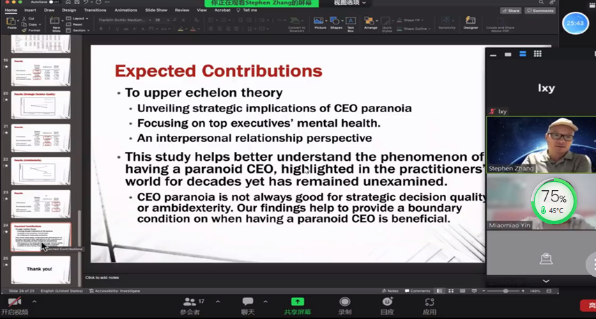 Stephen Zhang教授汇报结束后,与参会老师和同学们就数据收集及分析,数据结果解释以及心理学研究视角等问题与张教授进行了深入的探讨。随后,本次讲座成功落下帷幕。通过与国际知名创业研究学者Stephen Zhang教授的学术交流,对商学与管理学院的教师和学生在拓宽研究思路、加强论文写作等方面起到很好的指导作用。参会同学们受益良多,获得了很多启发与感悟。