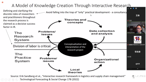 首先,苏雄义教授介绍了合作研究的三种类型:互动研究Interactive research (IR)、行动研究action research (AR)、设计科学研究design science research (DSR)。苏教授简要介绍了互动研究的起源和特点,指出互动研究是目前主要在北欧学术界常采用的一种研究范式,并介绍了相关研究的进展,本次报告的内容主要聚焦于行动研究,而设计科学研究将在下一次报告中讲解。