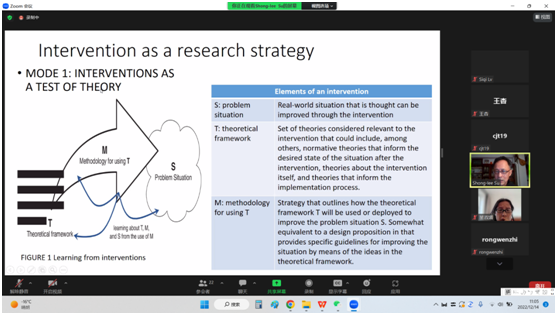 苏教授还以自己2021年发表在SSCI期刊上的一篇设计科学研究论文A design science-based case study of retail chain delivery operations and its implications 为例,详细介绍了该研究的起源、开展实践行动的过程、写作、投稿及修改的全过程。整场报告持续了2个小时,在总结环节,樊雪梅副院长感谢苏教授为我们主讲了案例研究系列四次系统、深入、务实的讲座,并表示未来希望和苏教授有更多的合作。