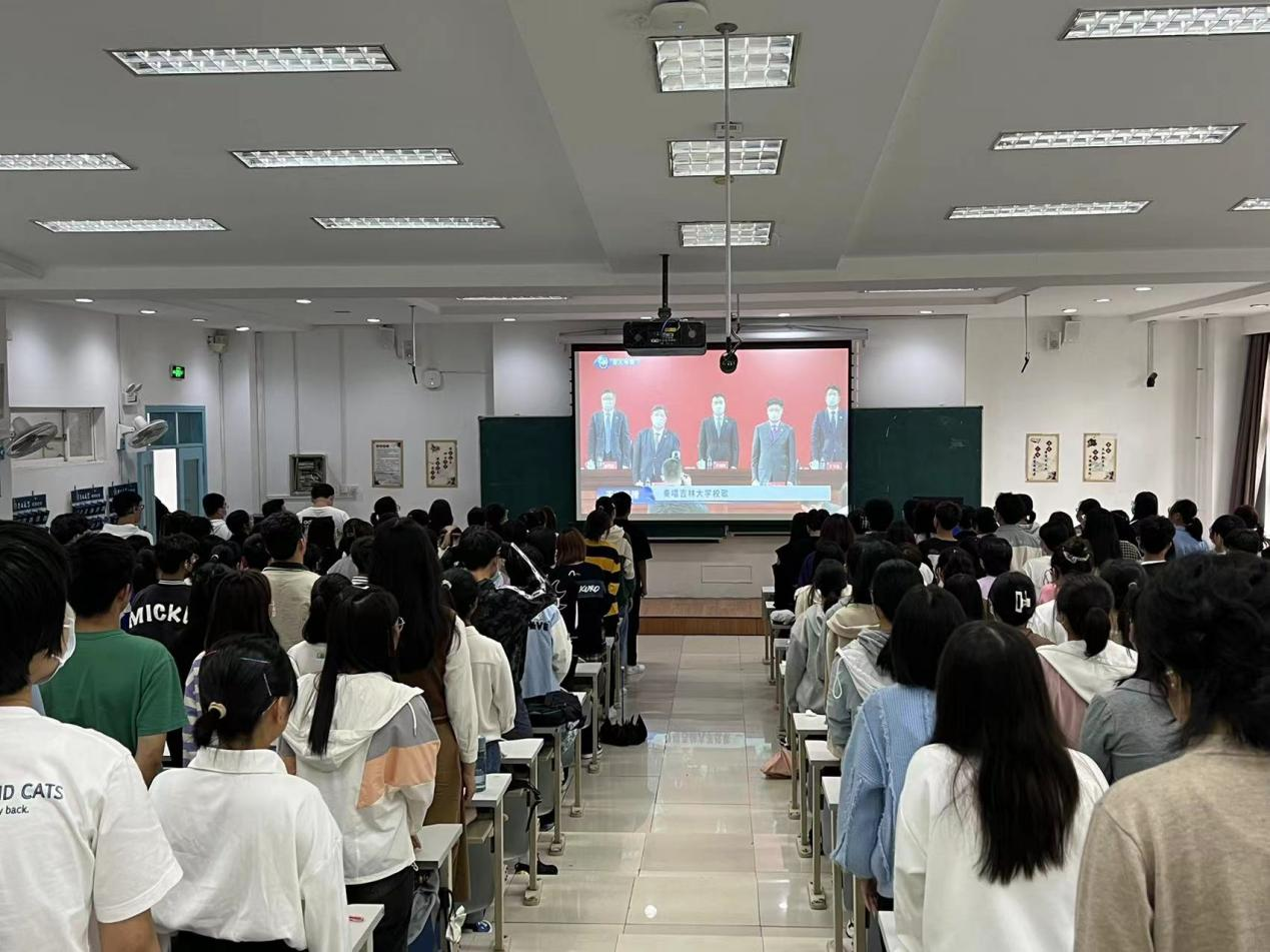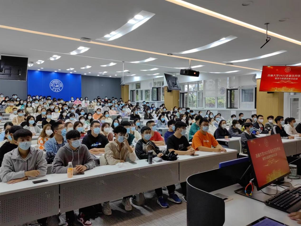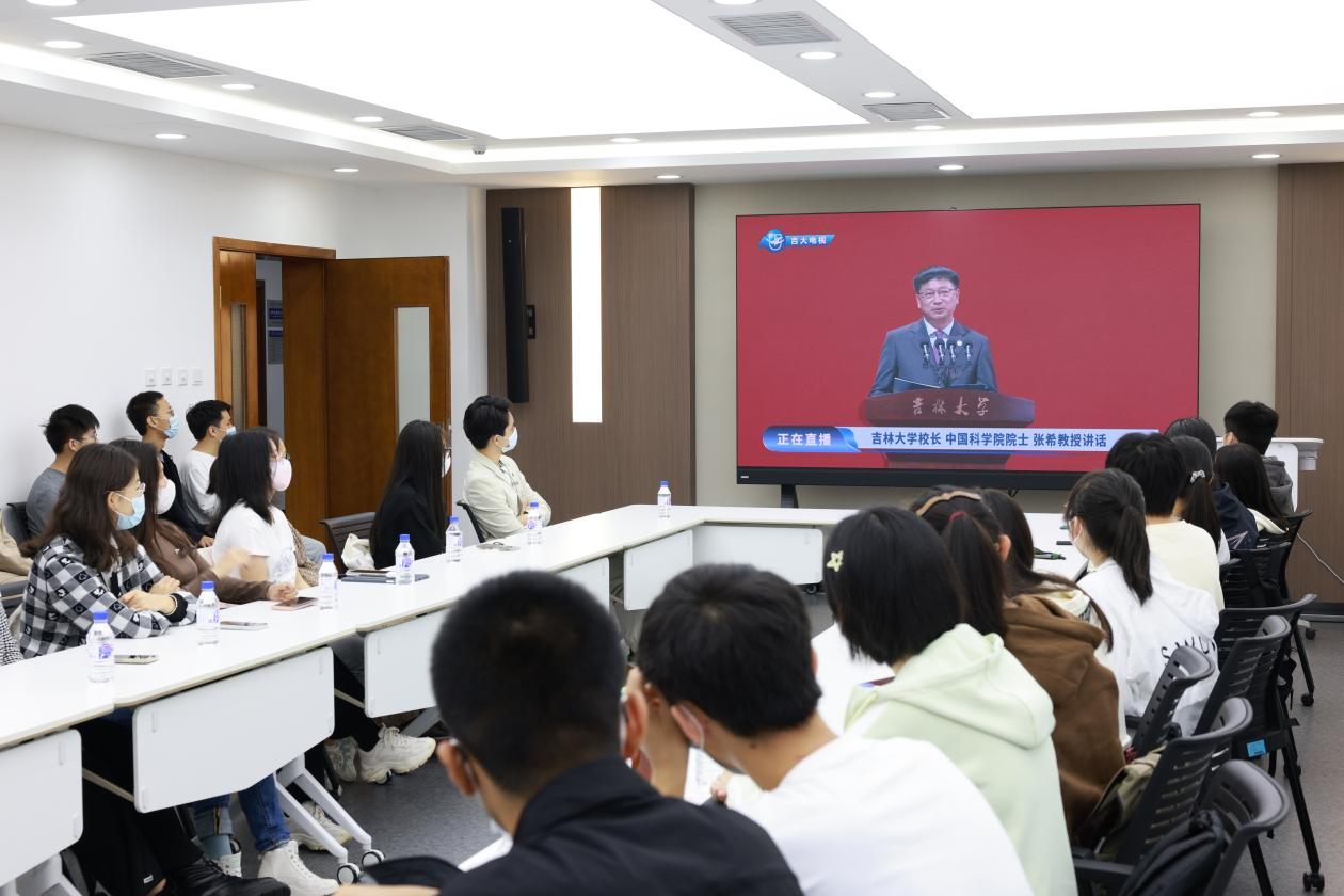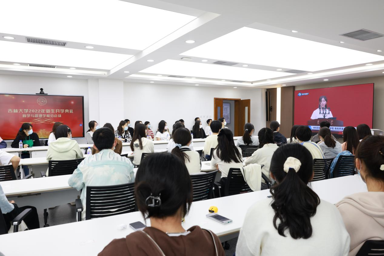 2022年9月15日上午八点三十分,吉林大学2022年开学典礼在中心校区宋治平体育馆举行。商学与管理学院积极响应学校要求,在中心校区布置四个分会场,在严格遵守长春市及吉林大学近期疫情防控要求的前提下,组织学院全体新生在线观看吉林大学2022年开学典礼。商学与管理学院党委书记赵军、商学与管理学院党委副书记兼副院长李帅与同学们共同观看。