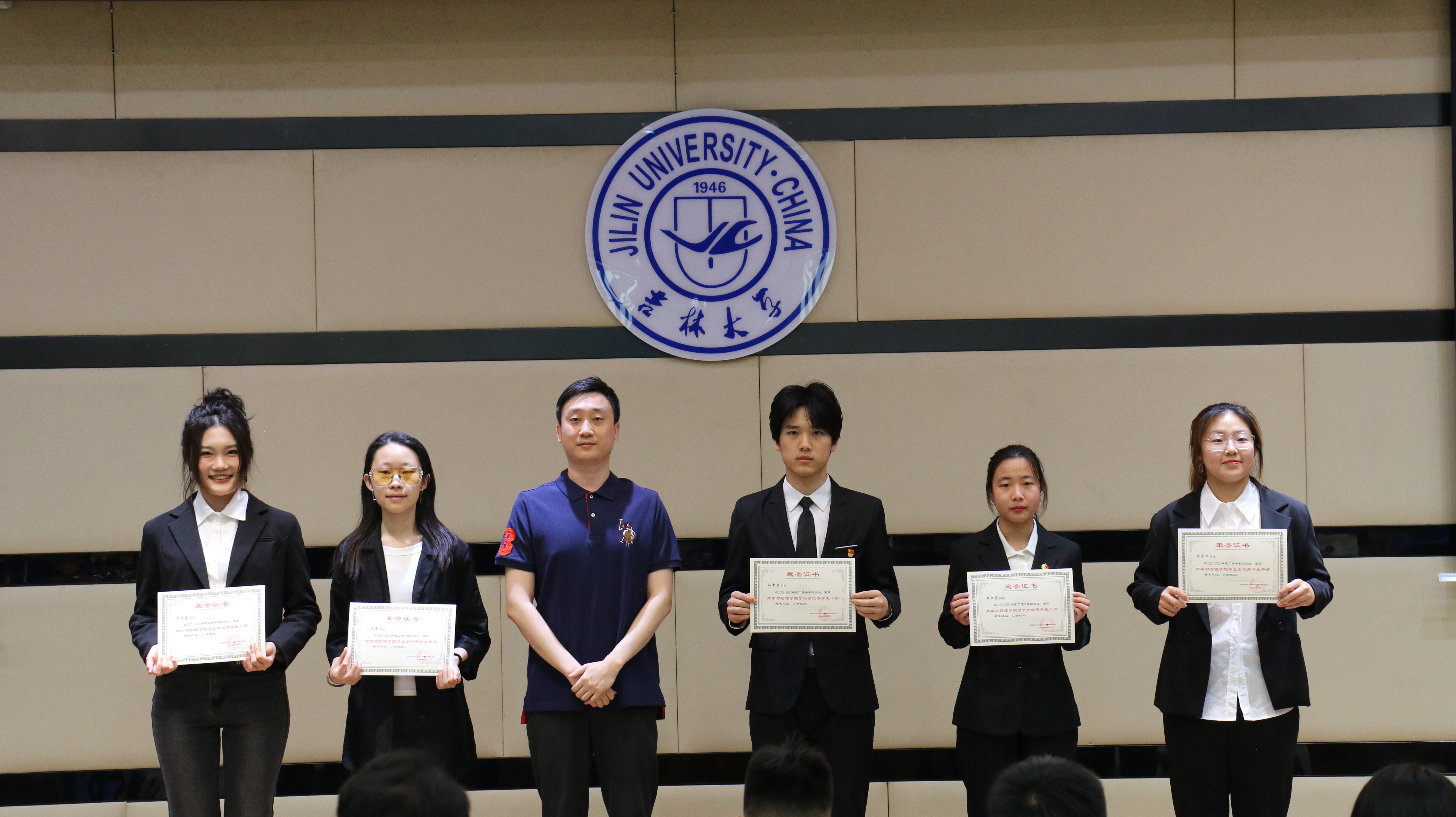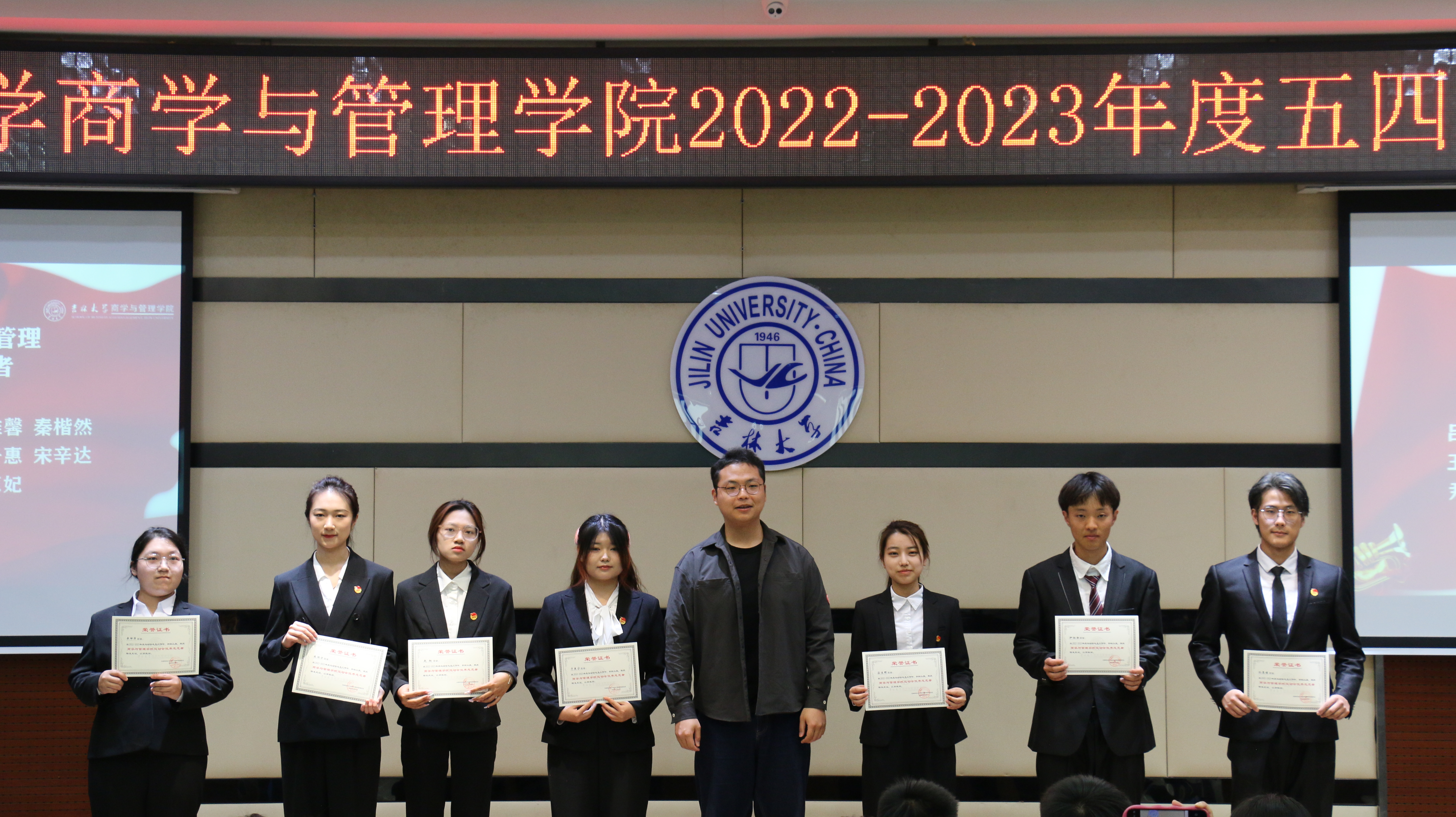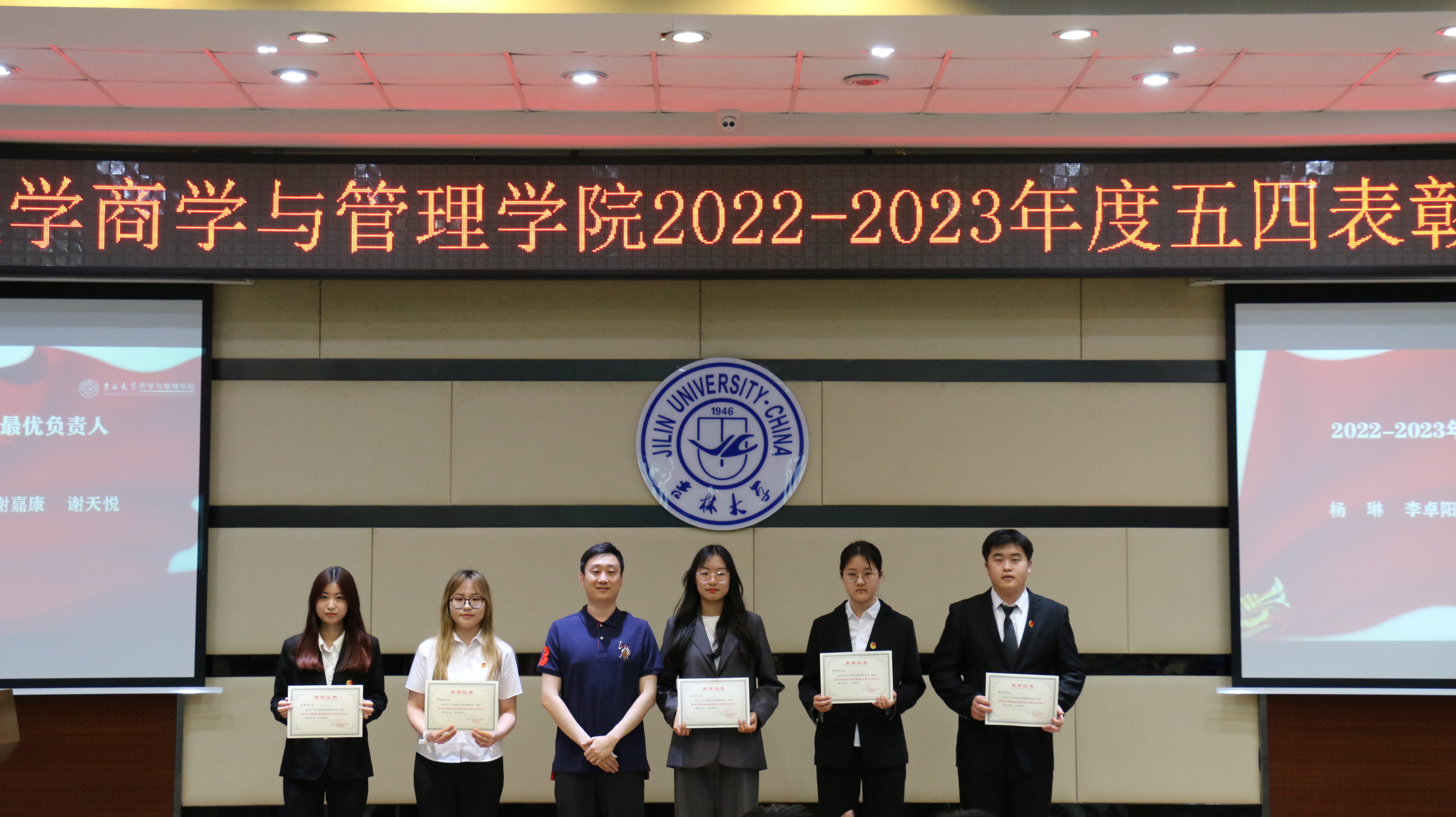 为了弘扬五四精神,激励青年学子积极奋进,以勇于担当、追求卓越的精神风貌,引领青年一代在新时代展现青春的主旋律,2023年5月27日,吉林大学商学与管理学院在东荣大厦B310举行了五四表彰大会。商学与管理学院党委副书记兼副院长李帅、学生办公室主任兼2021级辅导员丁越、团委书记兼2020级辅导员刘天目、2019级辅导员刘翔宇、2021级辅导员曲盛妍、2022级辅导员李毓、2022级辅导员贾奇达、2020级辅导员禚传阳以及各位获奖学生代表出席了本次会议。