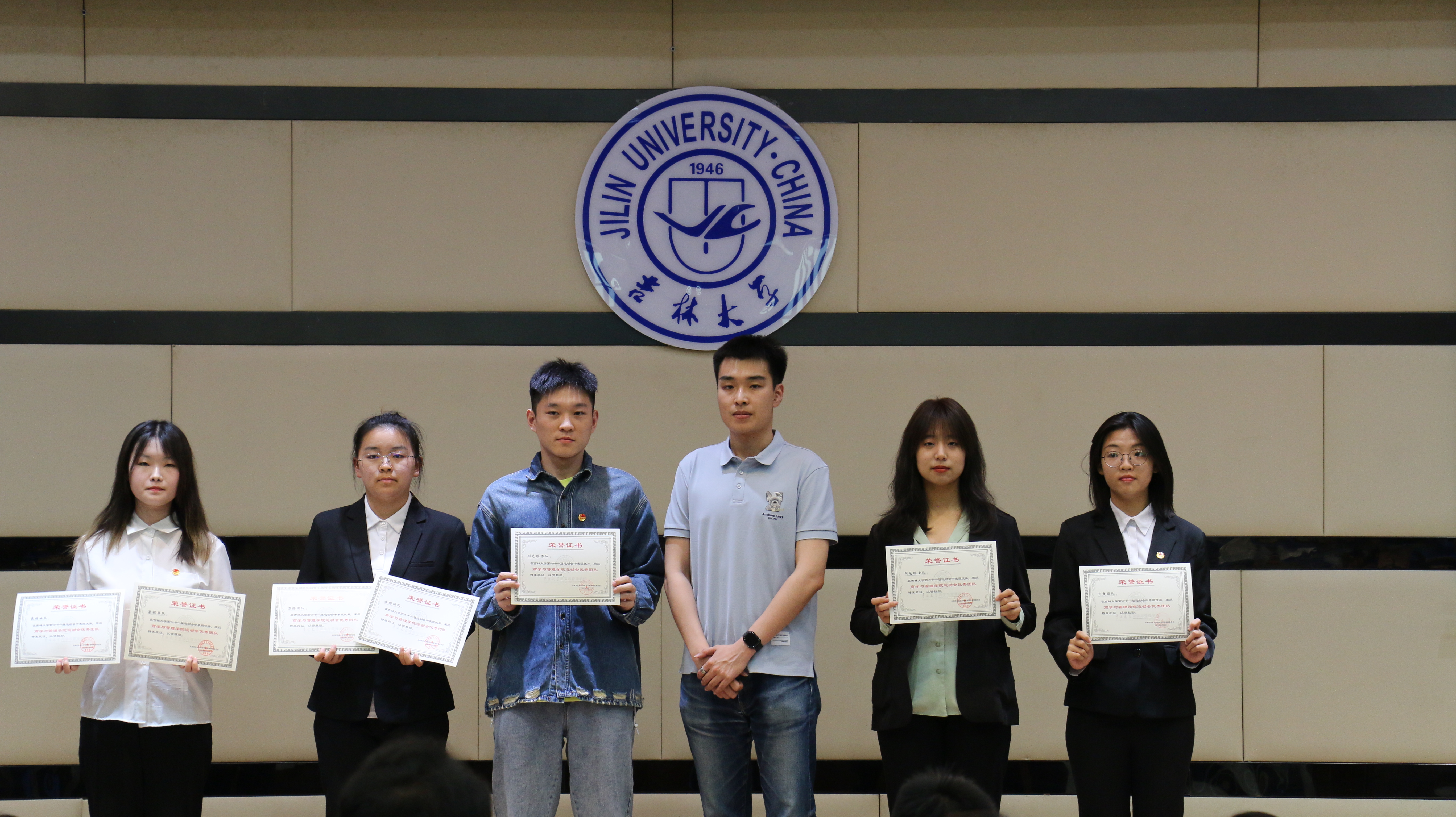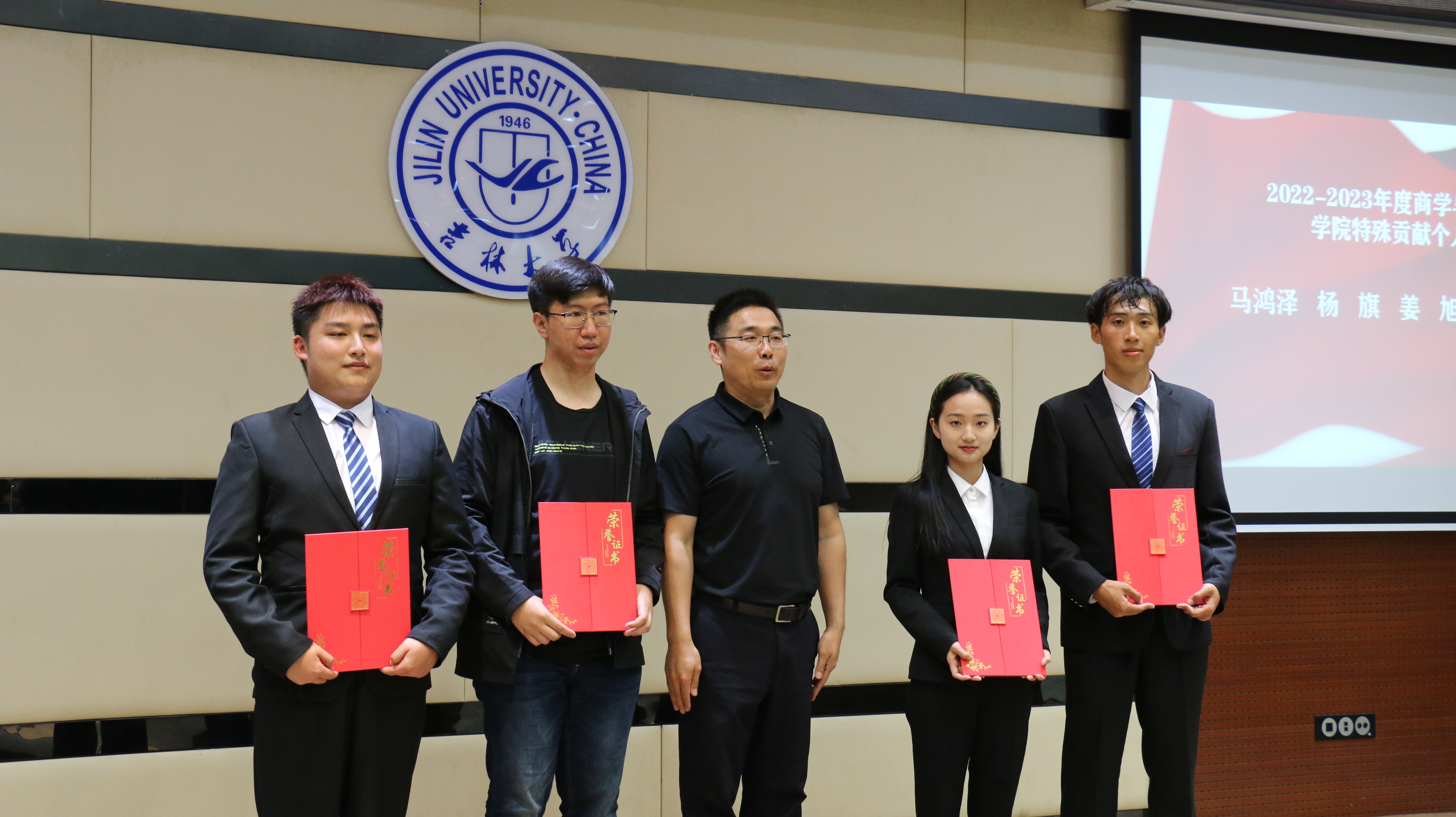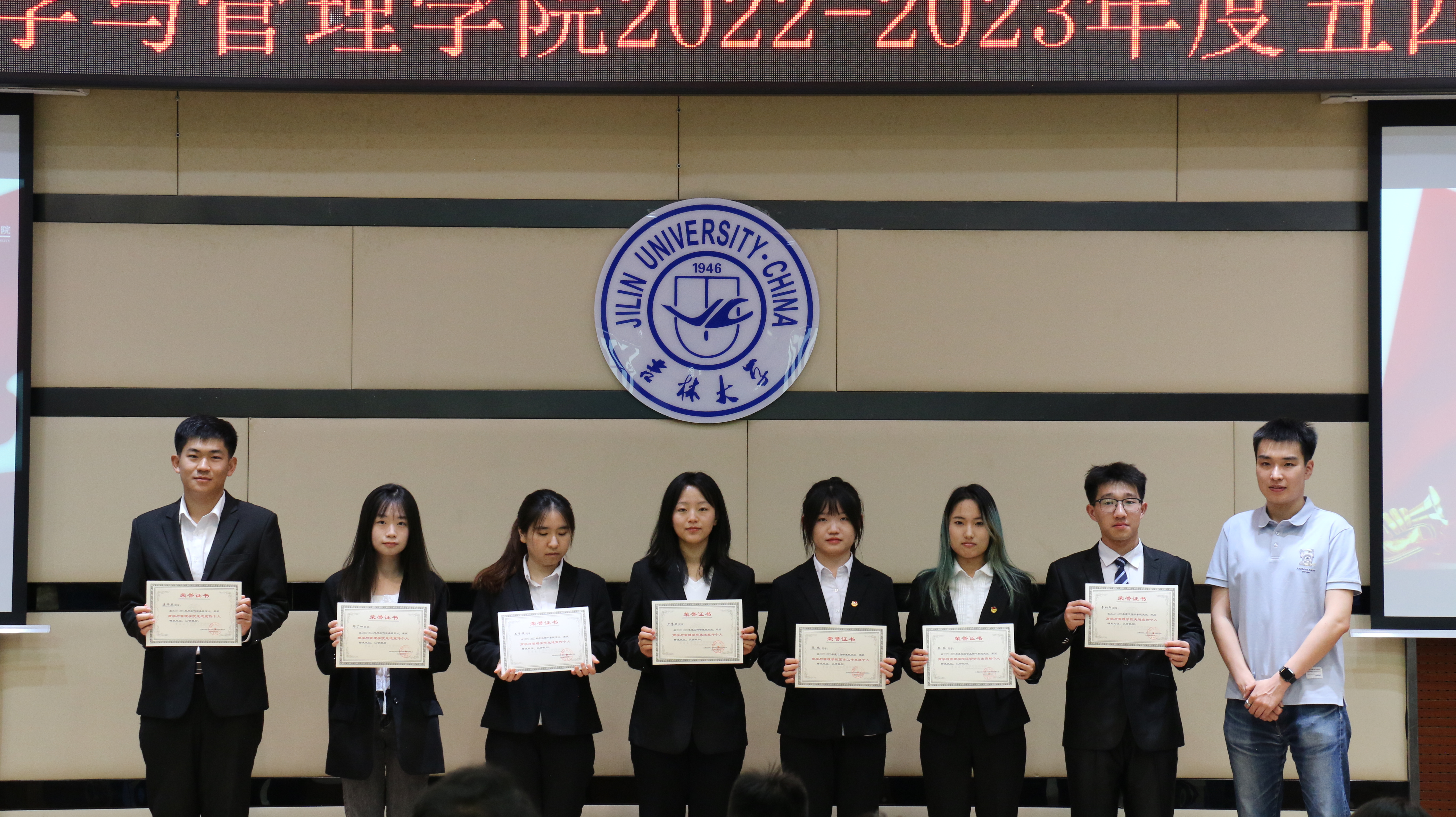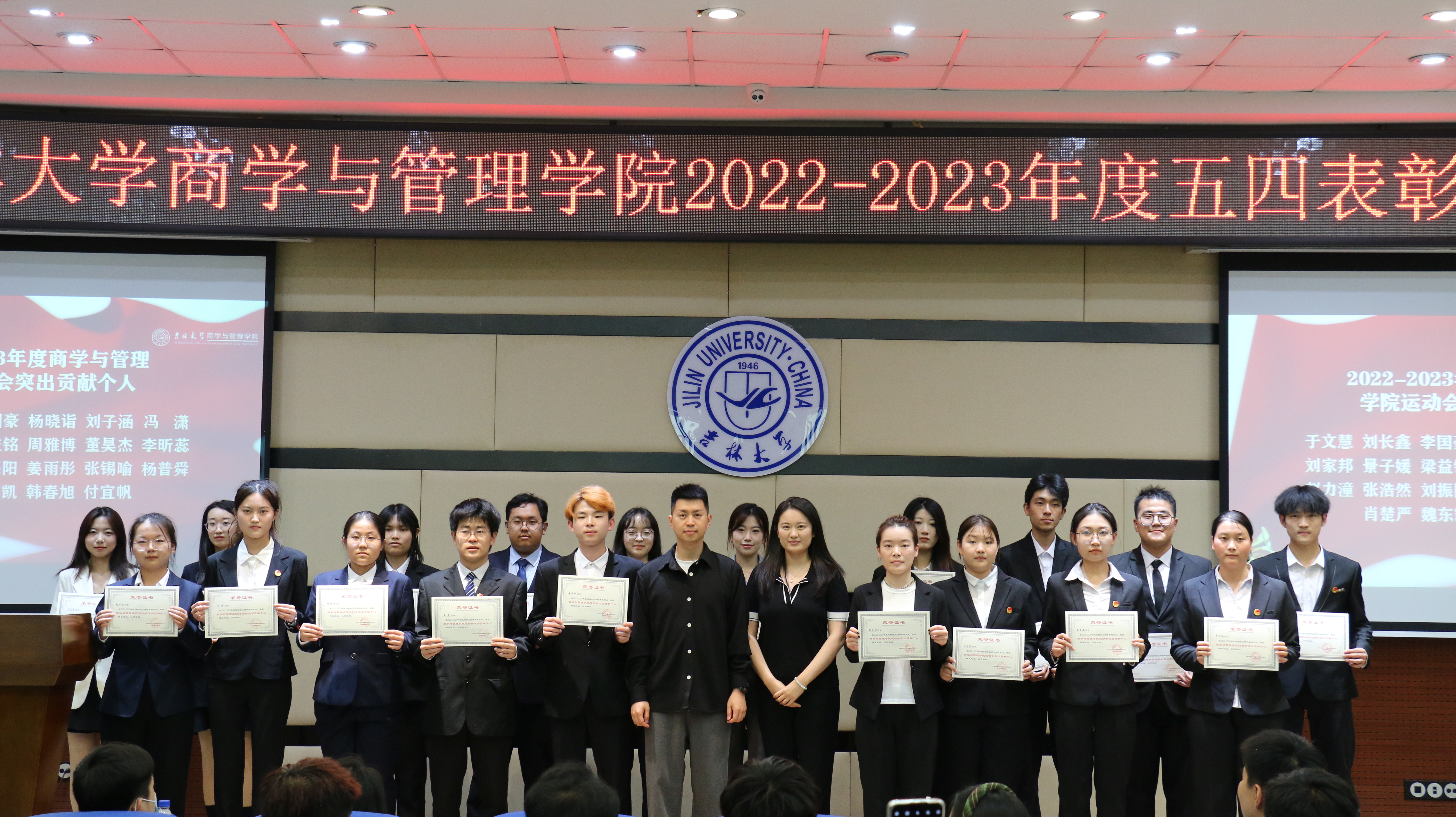 为了弘扬五四精神,激励青年学子积极奋进,以勇于担当、追求卓越的精神风貌,引领青年一代在新时代展现青春的主旋律,2023年5月27日,吉林大学商学与管理学院在东荣大厦B310举行了五四表彰大会。商学与管理学院党委副书记兼副院长李帅、学生办公室主任兼2021级辅导员丁越、团委书记兼2020级辅导员刘天目、2019级辅导员刘翔宇、2021级辅导员曲盛妍、2022级辅导员李毓、2022级辅导员贾奇达、2020级辅导员禚传阳以及各位获奖学生代表出席了本次会议。