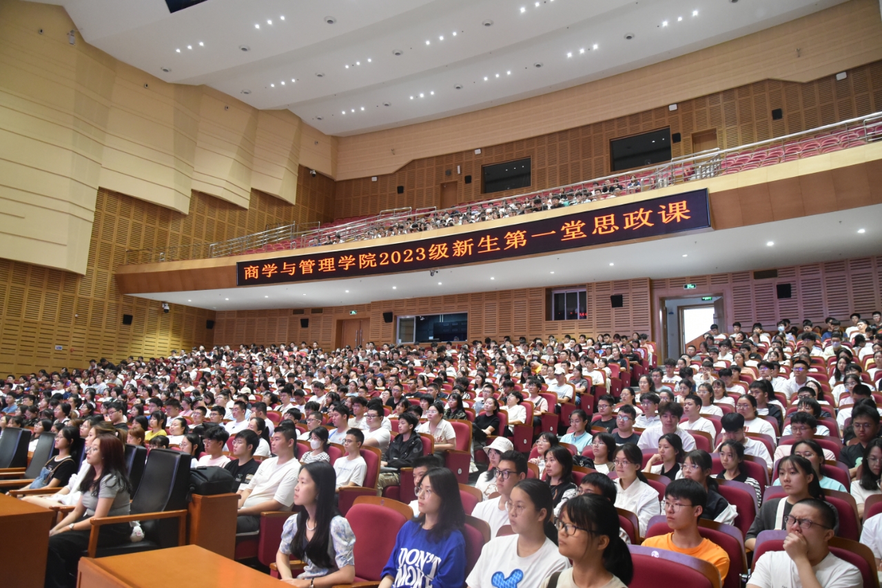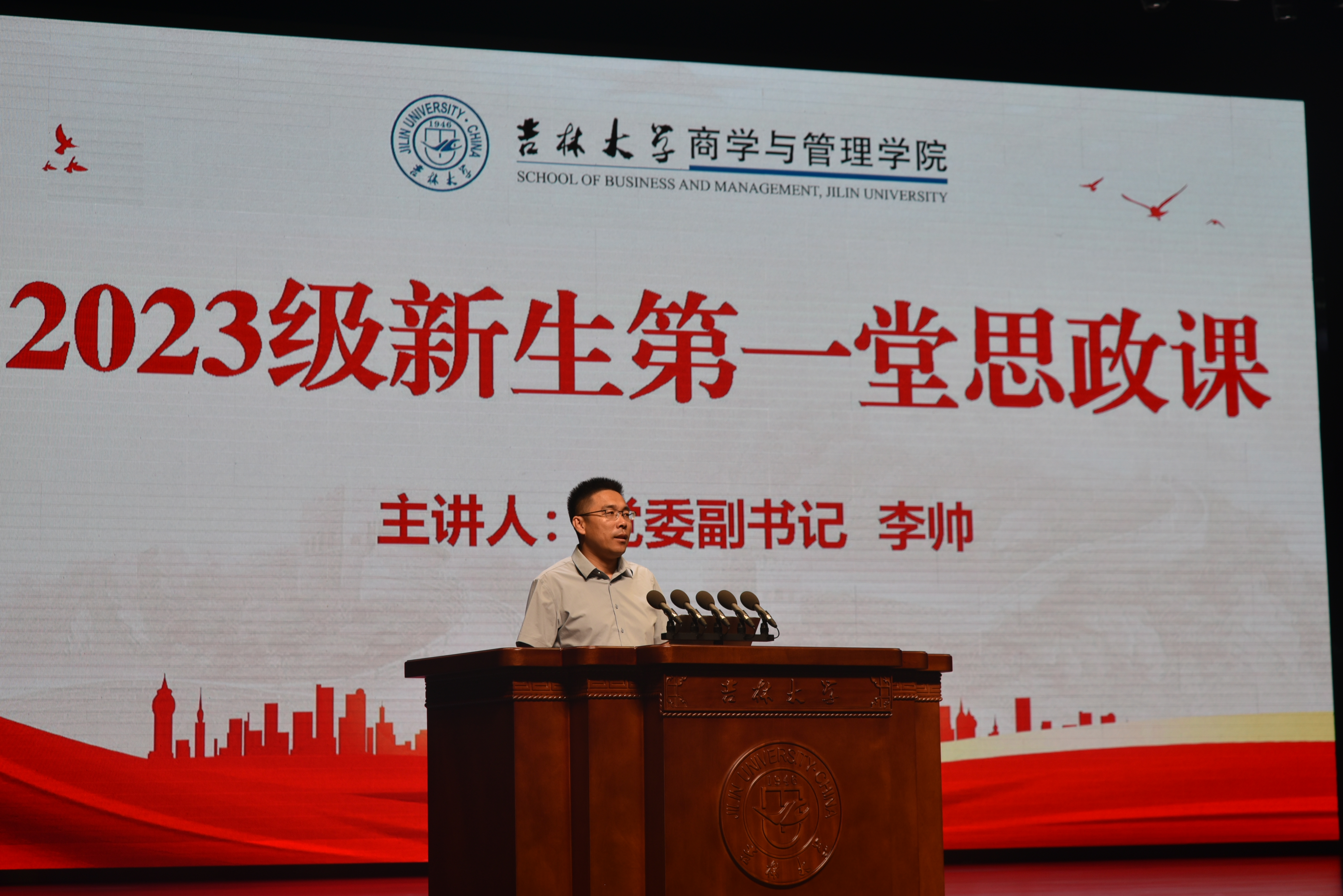 2023年8月30日上午9:30,吉林大学商学与管理学院于鼎新大讲堂开展了新生第一堂思政课,此次思政课由商学与管理学院党委副书记兼副院长李帅老师主讲,2023级全体新生参加。