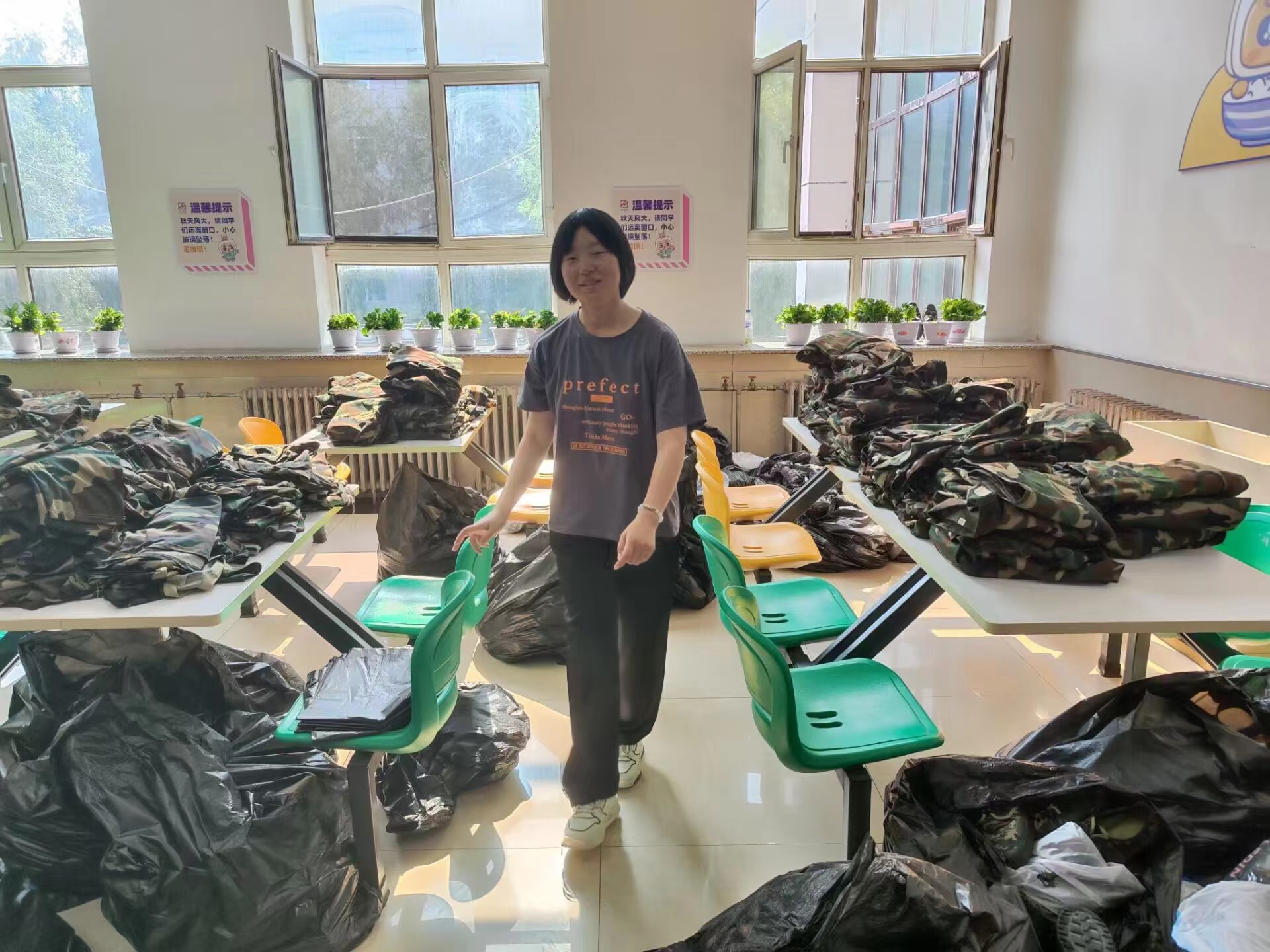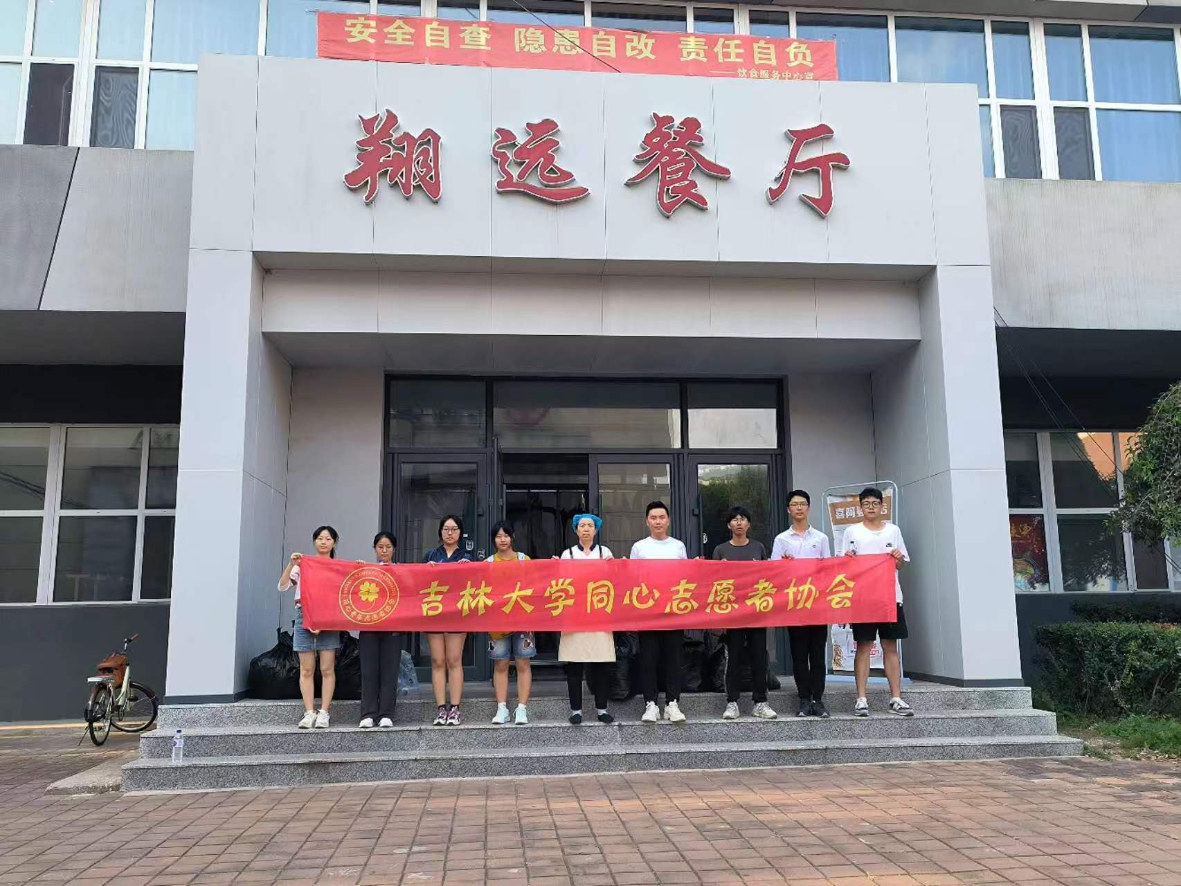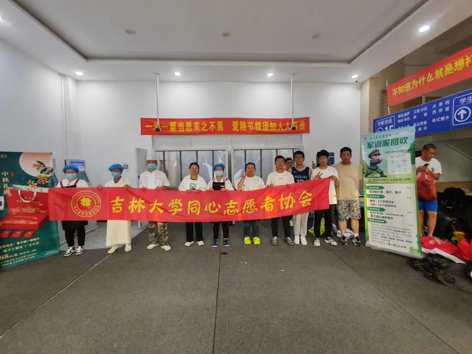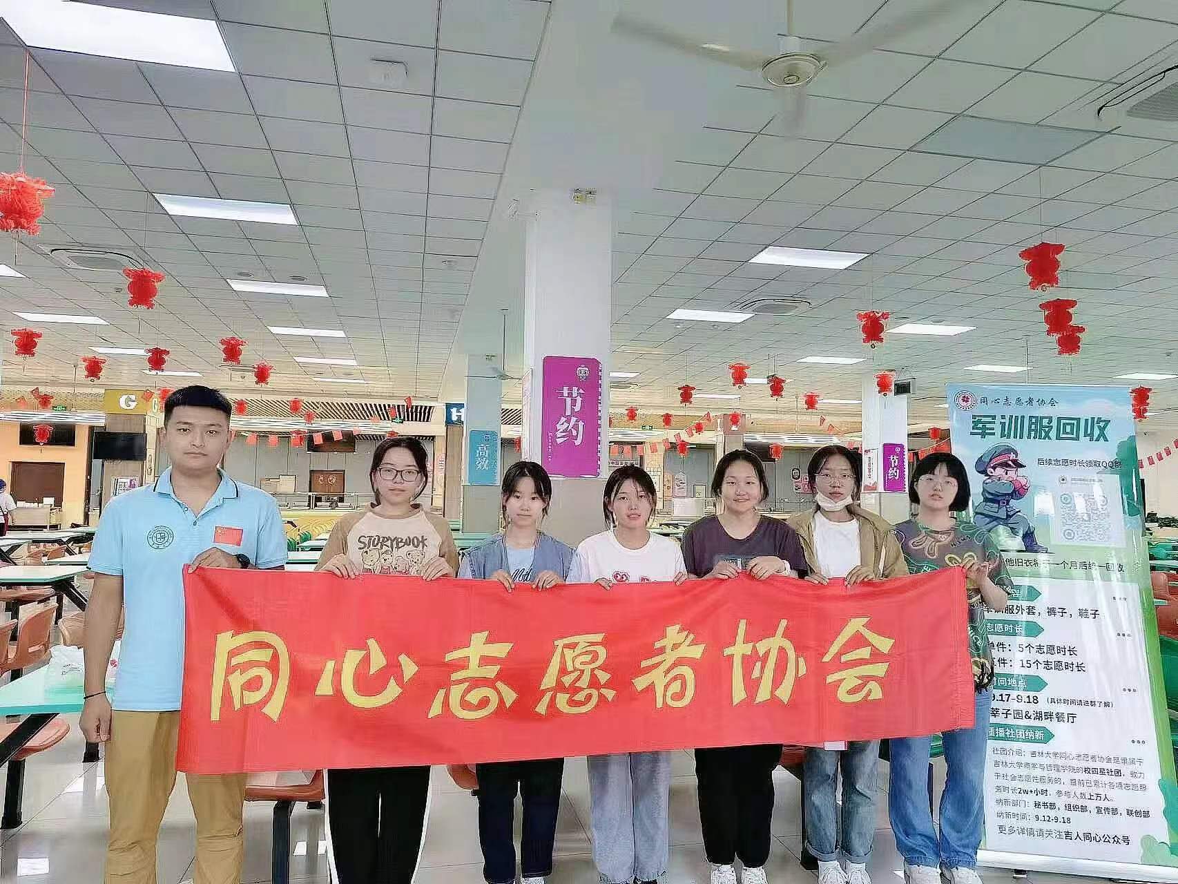 为弘扬勤俭、节约的美德,践行“绿水青山就是金山银山”的绿色生活方式,传递“奉献、友爱、互助、进步”的志愿者精神,在院团委的支持下,吉林大学同心志愿者协会于2023年9月16日至9月17日在翔远餐厅、莘子园餐厅以及湖畔餐厅举行了军训服回收活动,将回收的军训服捐赠给食堂的工作人员。