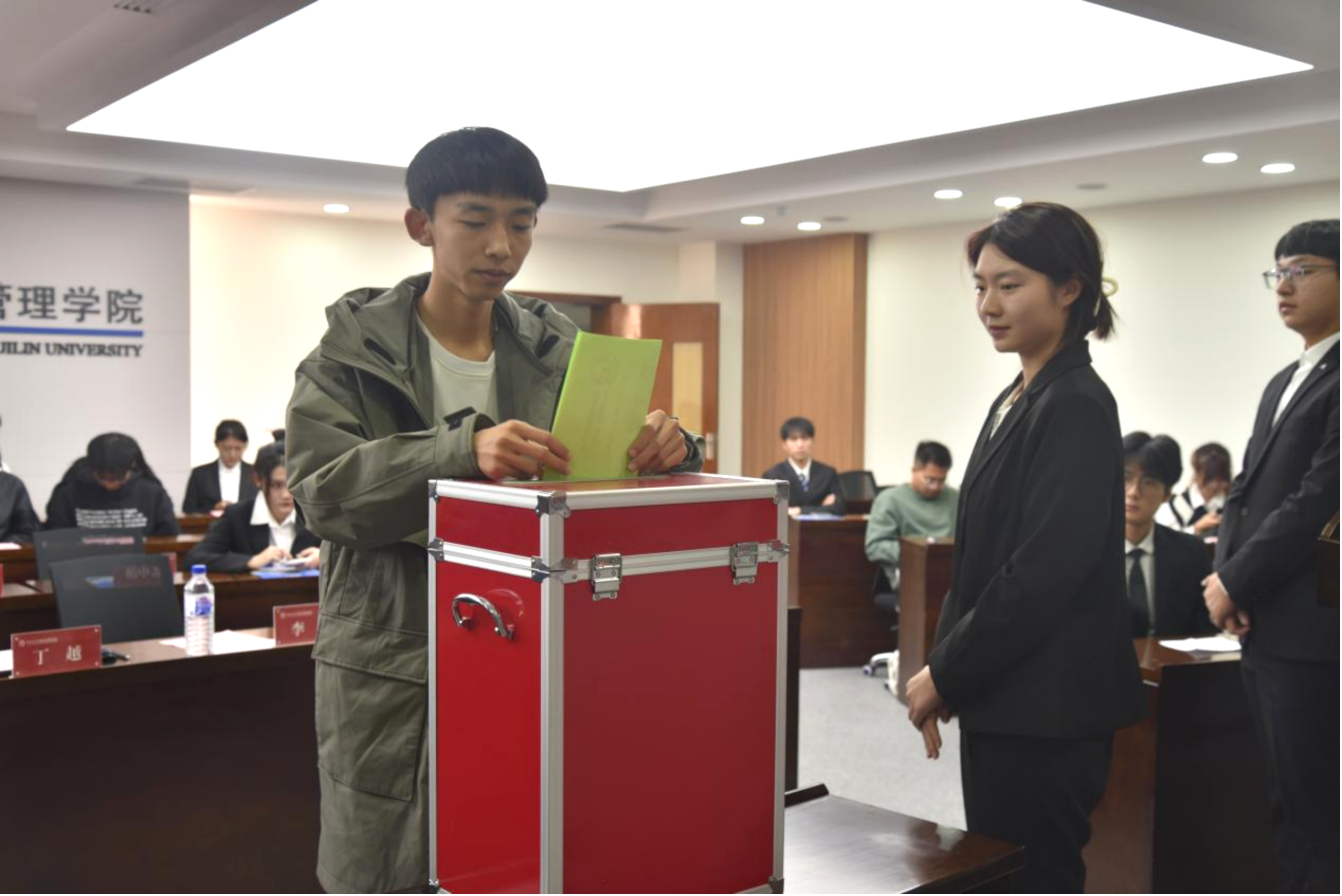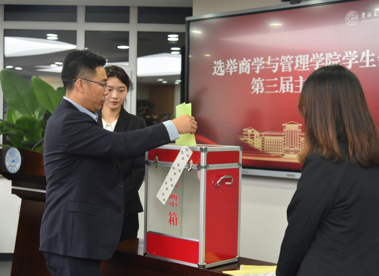 随后,由主持人宣读选举办法并对选举人进行选举。在监票人和计票人的监督下,大会最终公布选举结果。王雪、刘家邦、魏东凯成功当选商学与管理学院第三届学生会主席团成员。紧接着,新一届主席团成员刘家邦代表发言,他表示商学与管理学院学生会必将不忘初心,砥砺前行,兢兢业业,追求卓越,做好学生会的各项工作。