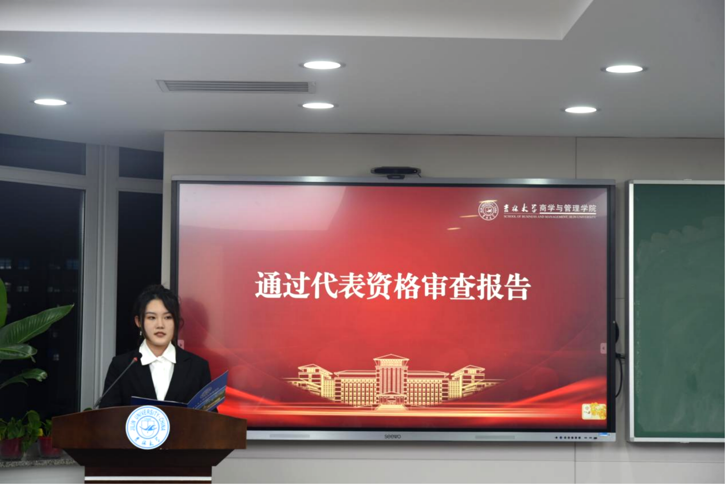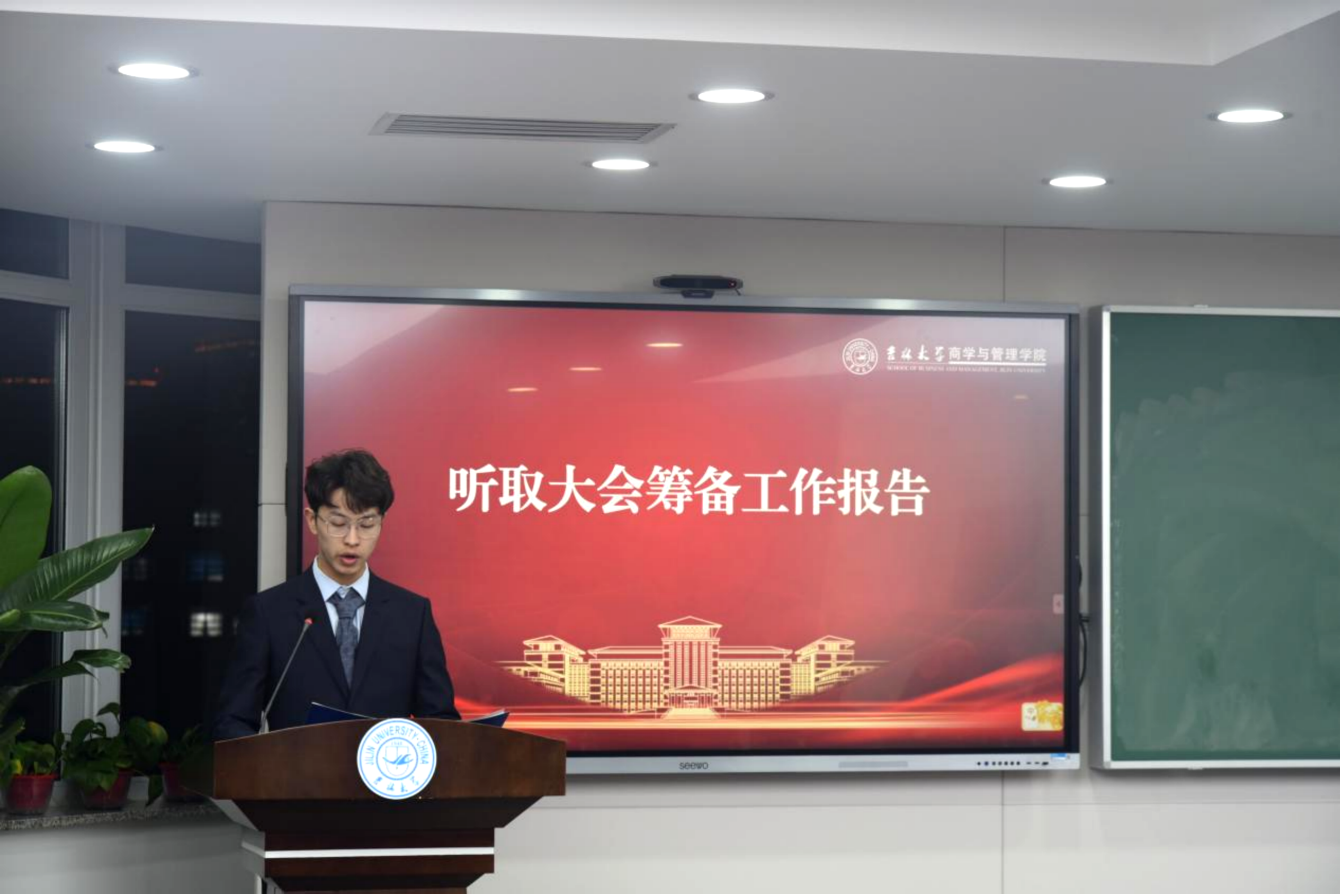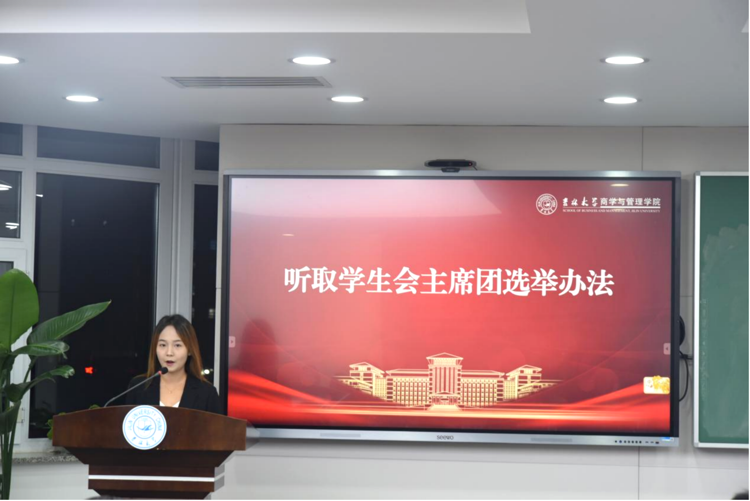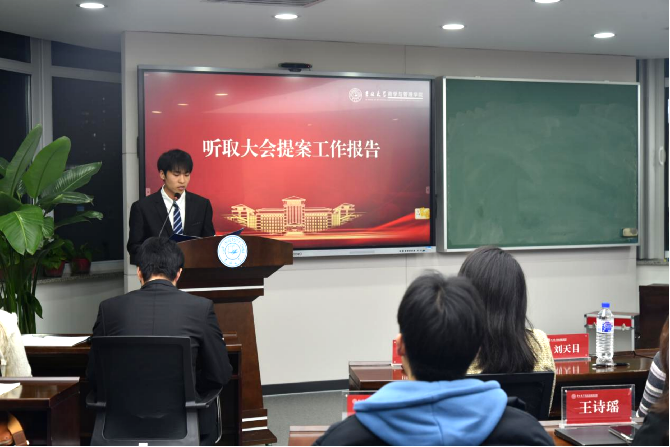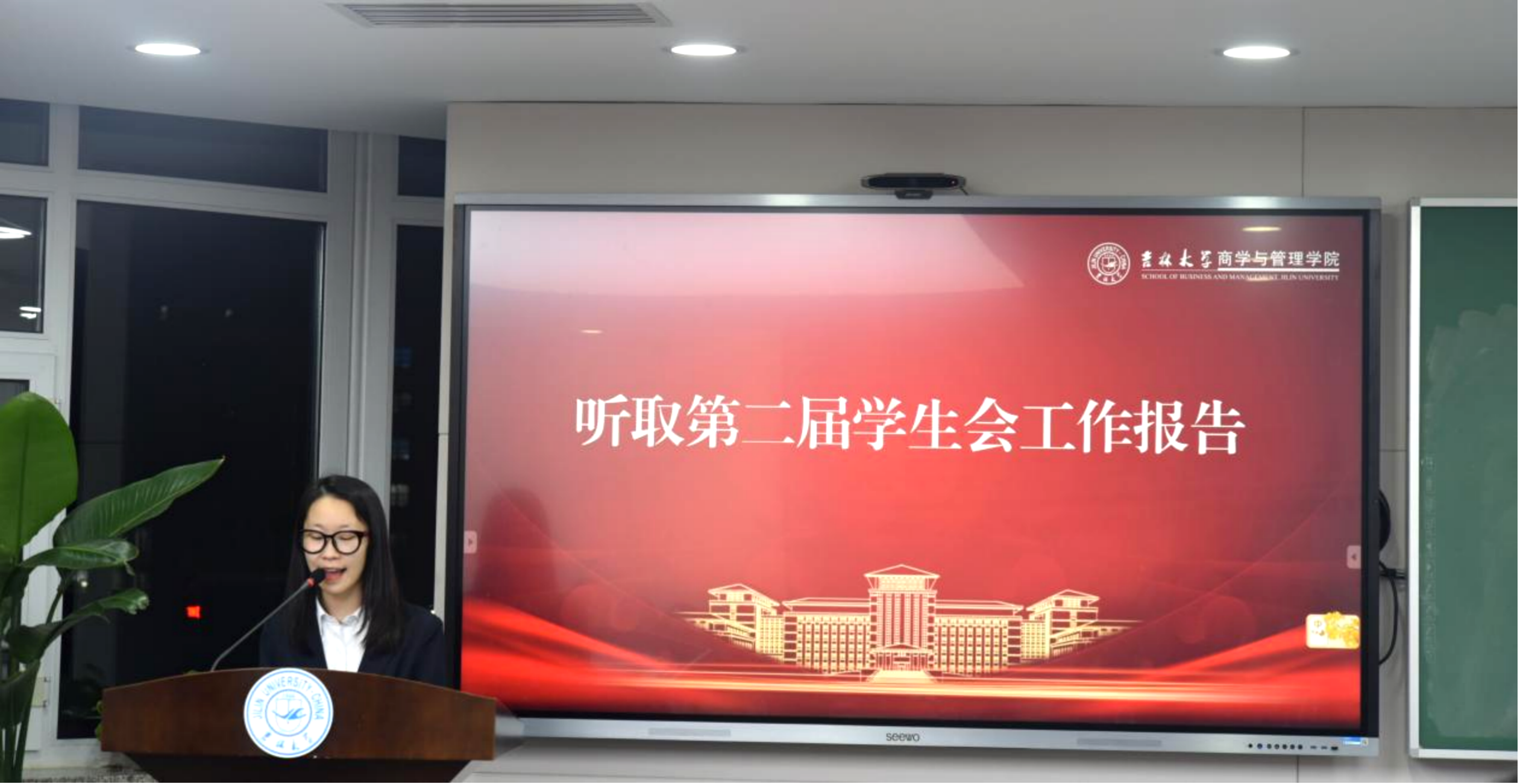 吉林大学商学与管理学院第二届学生会主席团成员柏申苏代表第二届学生会做以《弦歌不辍担初心使命,奋楫扬帆谱商管篇章》为题的工作报告,介绍了学生会在过去一年的卓然成效和未来工作规划。接着,大会听取并表决通过了学生会工作报告、学生组织绩效考核方案、总监票员、监票员、总计票员、计票员名单和学生会第三届主席团候选人名单。