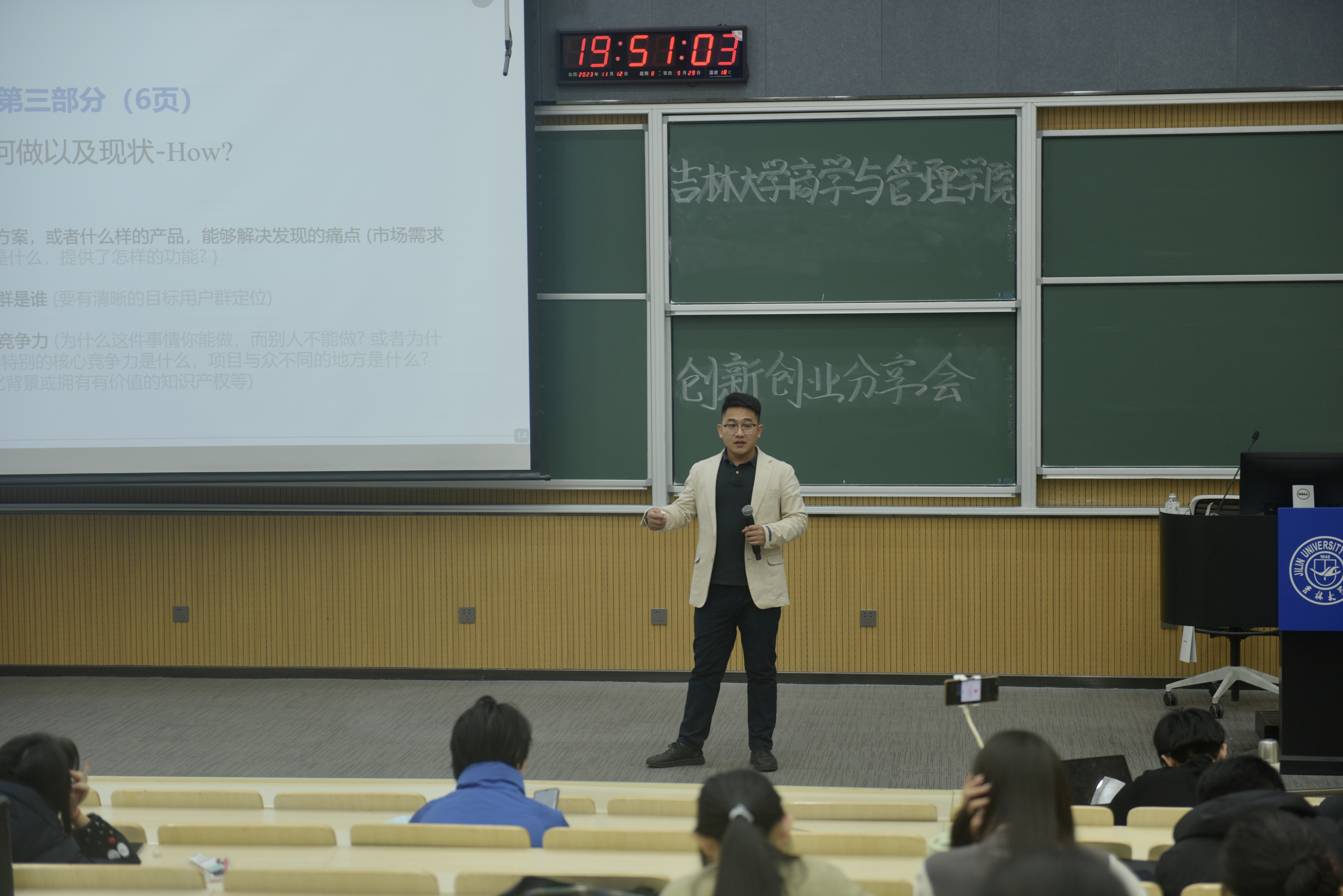 本次分享会邀请了吉林大学商管学院博士研究生、“互联网+”大学生创新创业大赛评审专家——王卫,作为主讲人为同学们做出分享。王卫师兄首先介绍了如何选择比赛项目,将初创组、成长组和创意组三个赛道各自的特点进行阐述,随后列出热门的项目大类,诸如乡村振兴、人工智能+医疗等,提出了宝贵的建议。其次,王卫师兄重点介绍了如何做出高质量的BP(商业企划书)PPT,从封面的制作到正文的内容涵盖,再到封底的制作,详细的讲述让在座的同学们都受益匪浅。