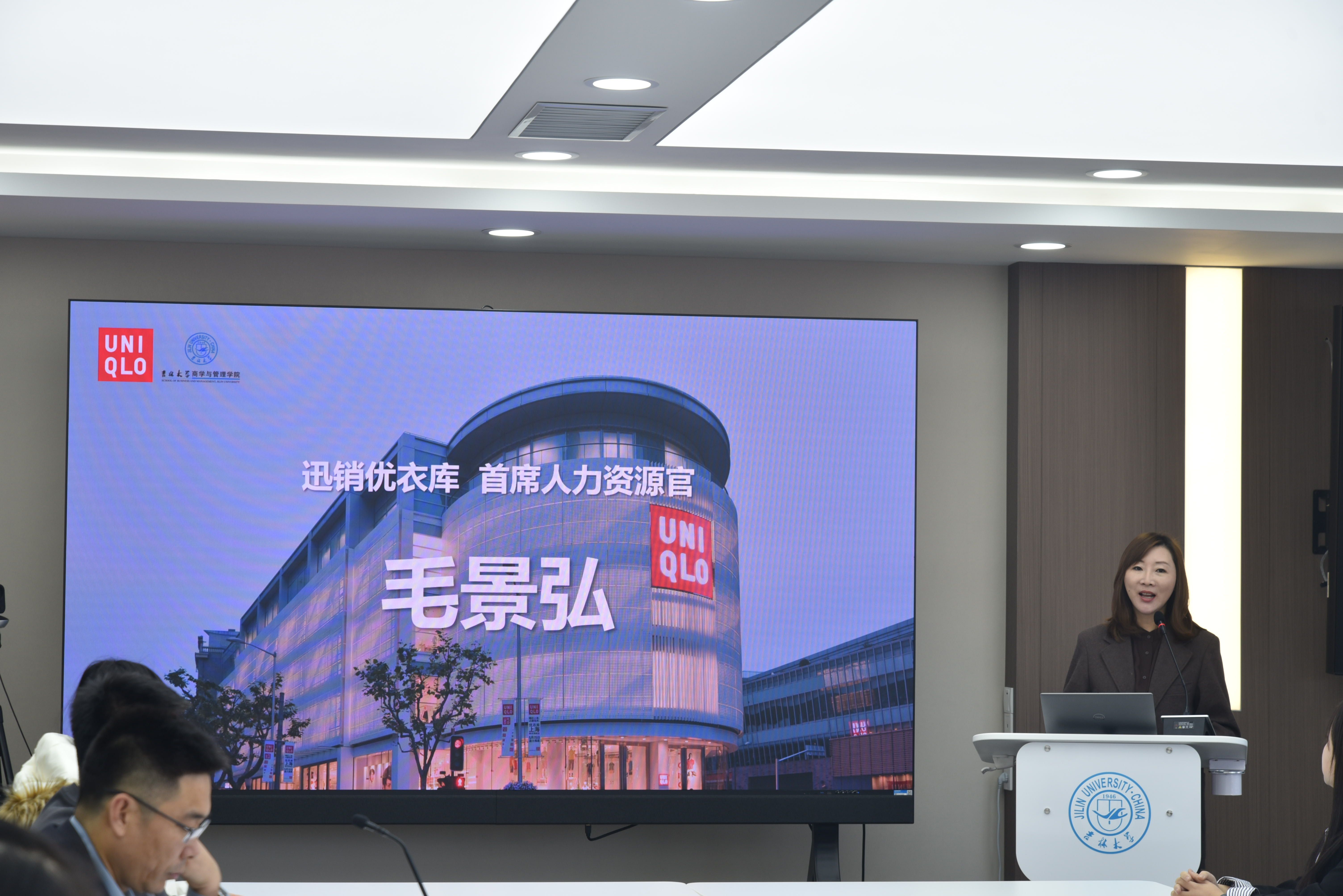 接着,迅销优衣库首席人力资源官毛景弘女士致辞,对于全国首个优衣库零售班的开班十分欣喜,毛女士希望同学们在接下来能够了解优衣库零售模式,对零售业,对优衣库产有更加深入的了解,希望优衣库与吉林大学的合作关系更加紧密,也希望通过这次零售班能够帮助学生更好的融入社会工作环境。