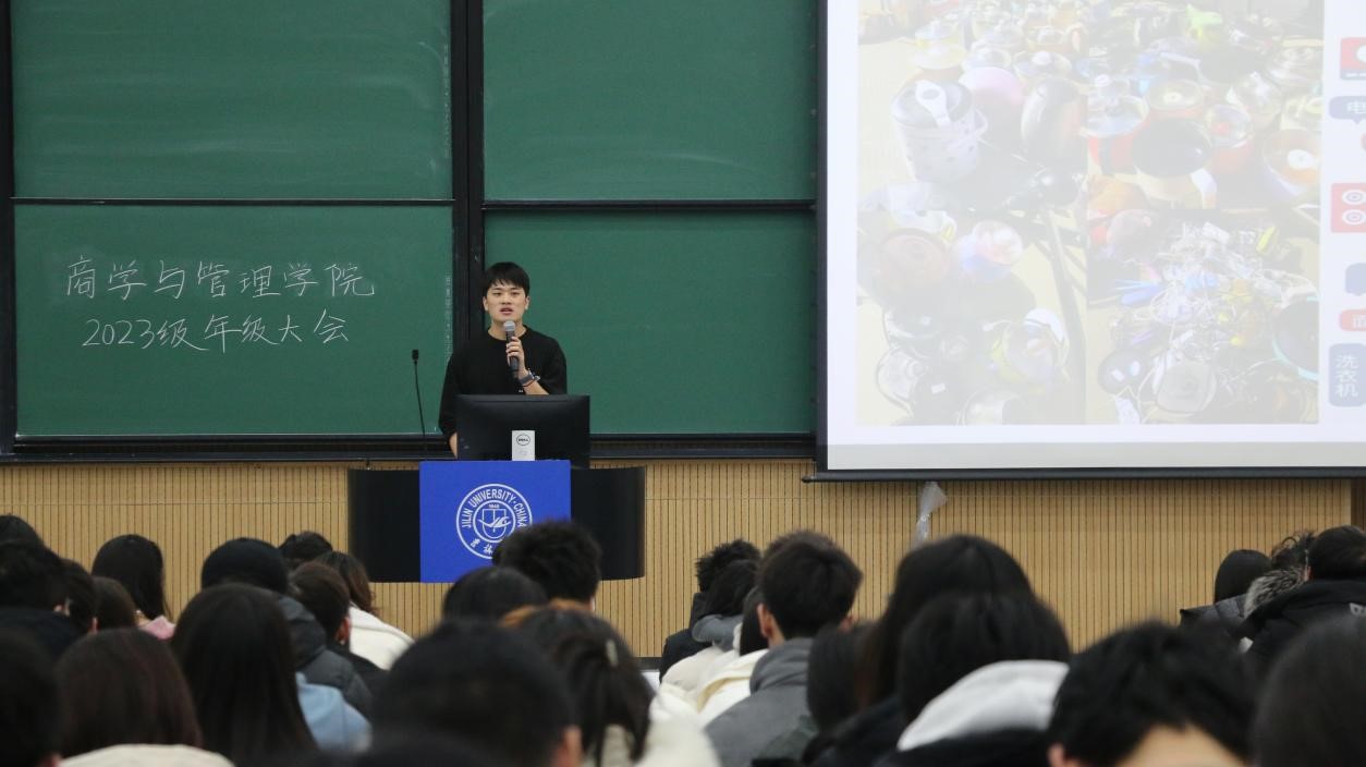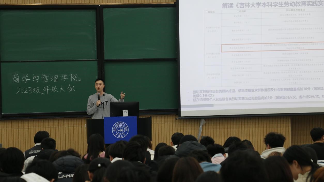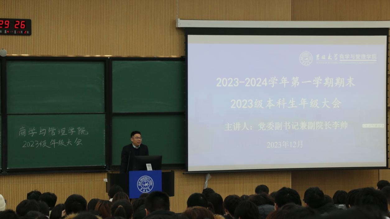 为确保2023级本科新生期末与寒假事宜进行顺利,商学与管理学院分别于2023年12月14日和12月15日的13:30,在敬信楼F区第一阶梯教室,召开2023级本科生年级大会。会议由2023级本科学生辅导员刘翔宇主持,商学与管理学院党委副书记兼副院长李帅讲话,新生辅导员罗小杰及商学与管理学院2023级全体本科生参加本次会议。