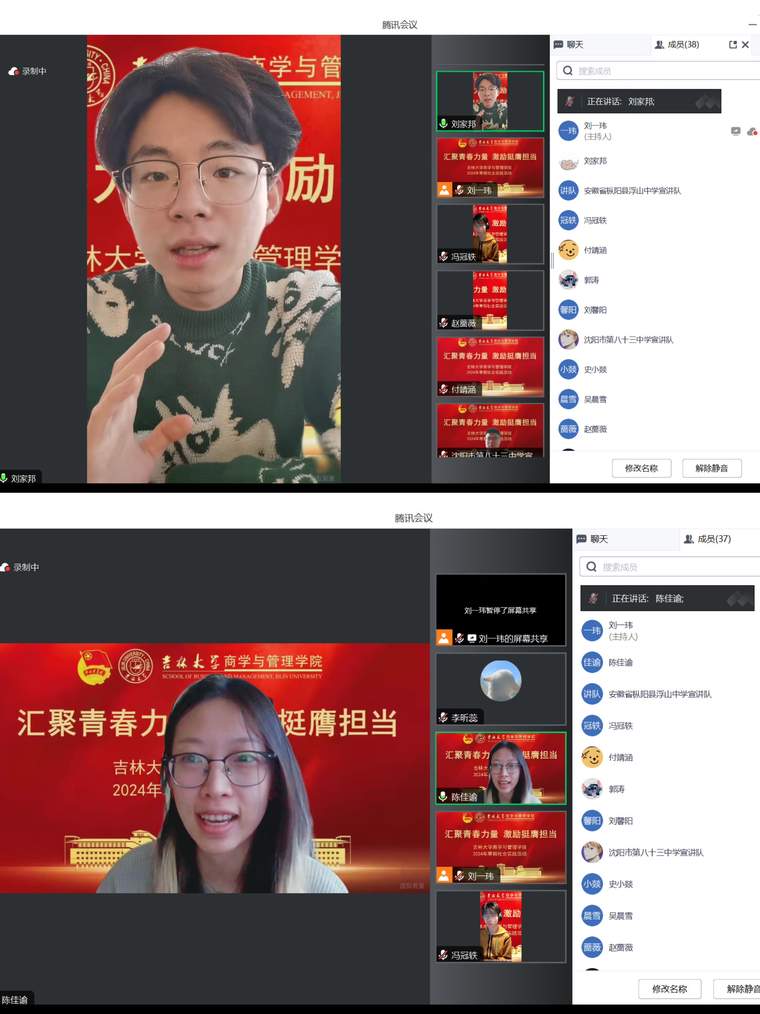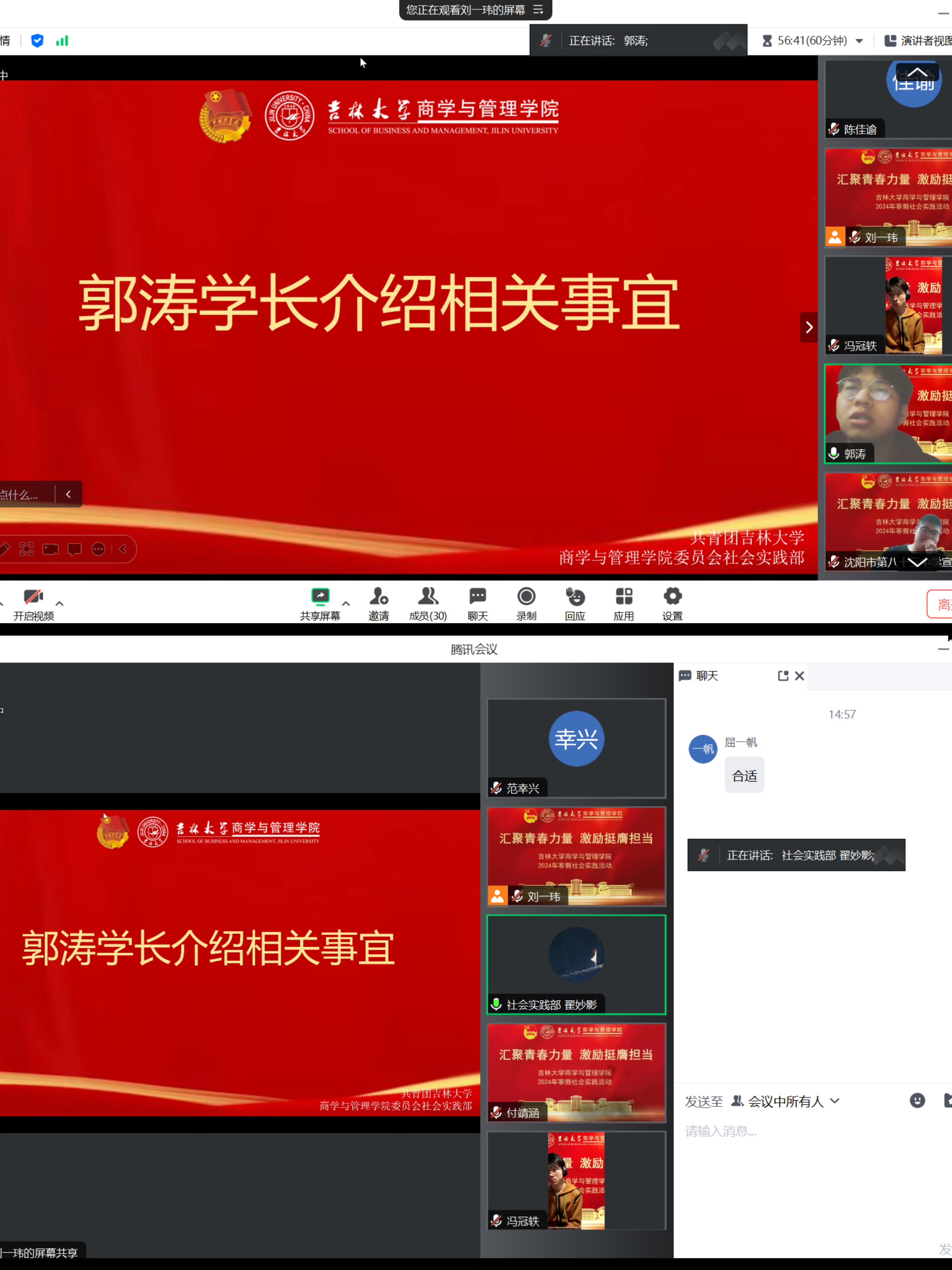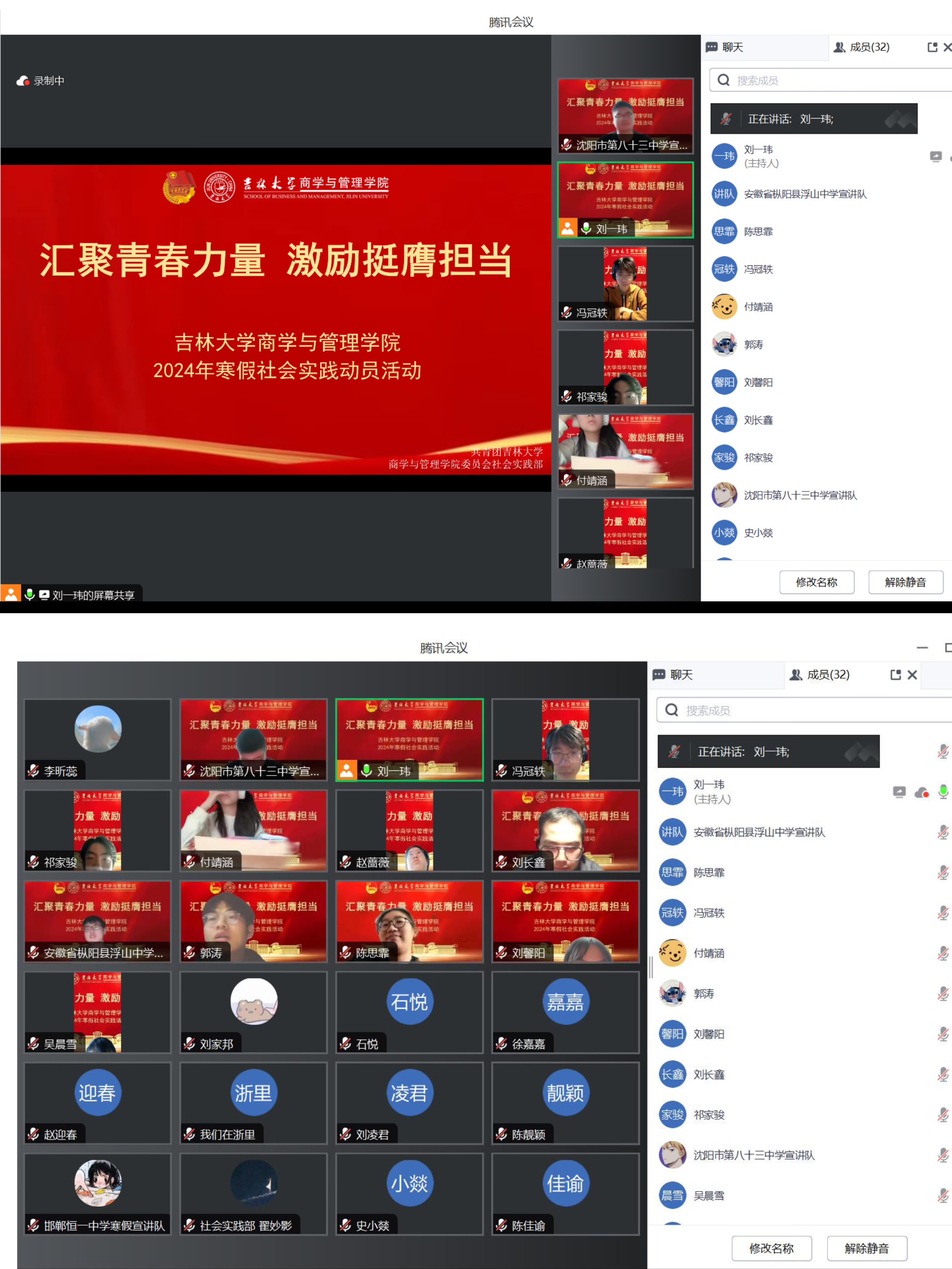 为增强青年学生的历史责任感和使命感,激发强国有我的青春激情,培养苦练本领、争先创优的品质,积极响应校团委关于组织开展吉林大学2024年寒假社会实践活动的通知,鼓励学生积极参加社会实践活动。共青团吉林大学商学与管理学院委员会1月9日于线上召开商学与管理学院2024年寒假实践活动动员大会,院团委书记刘天目老师、团学组织干部郭涛、翟妙影、刘家邦和陈佳瑜参与会议。