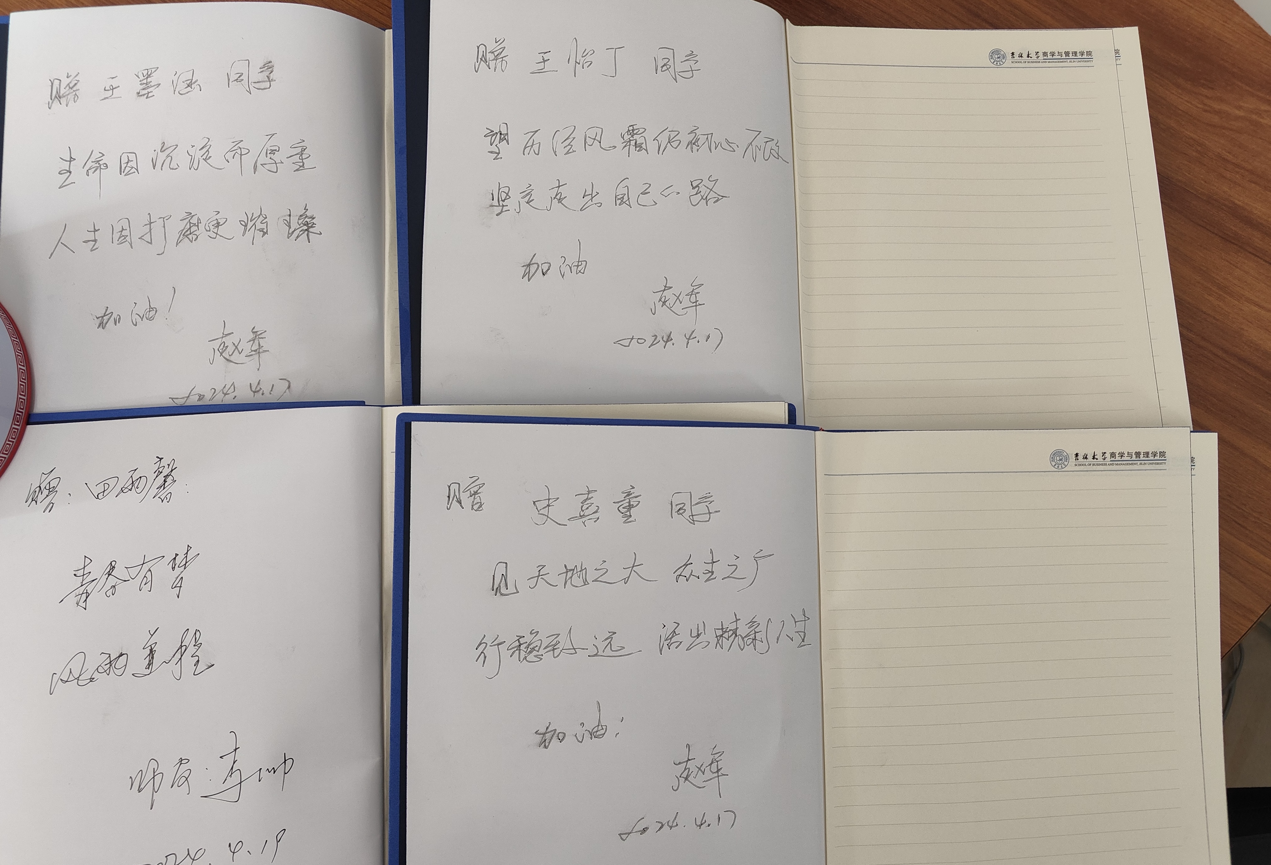 随后,李帅老师和罗小杰老师亲自为转出同学递送了印有商学与管理学院标识的笔记本,李帅老师说到,这份来自商学与管理学院的纪念礼物送给大家,希望同学们铭记在商学与管理学院的一年精彩生活,大家永远是商学与管理学院的一份子,老师们也永远会为大家保驾护航,话语间充分流露出对同学们的关怀之情。更为细心的是,在每一本给予同学们的笔记本上,都有来自学院党委书记赵军老师、李帅老师、陈卓老师和罗小杰老师写下的对转出同学的殷切希望和衷心祝福。