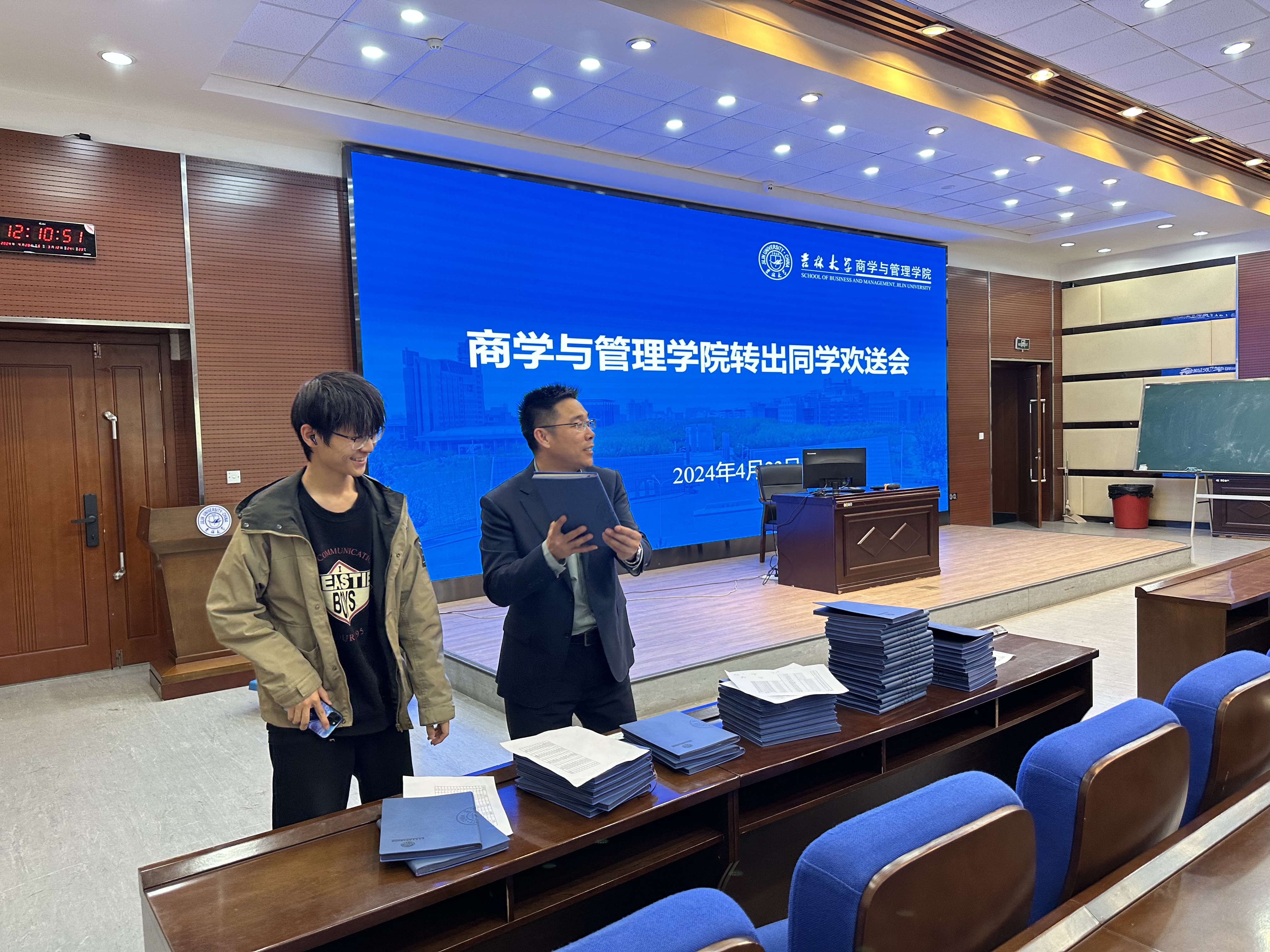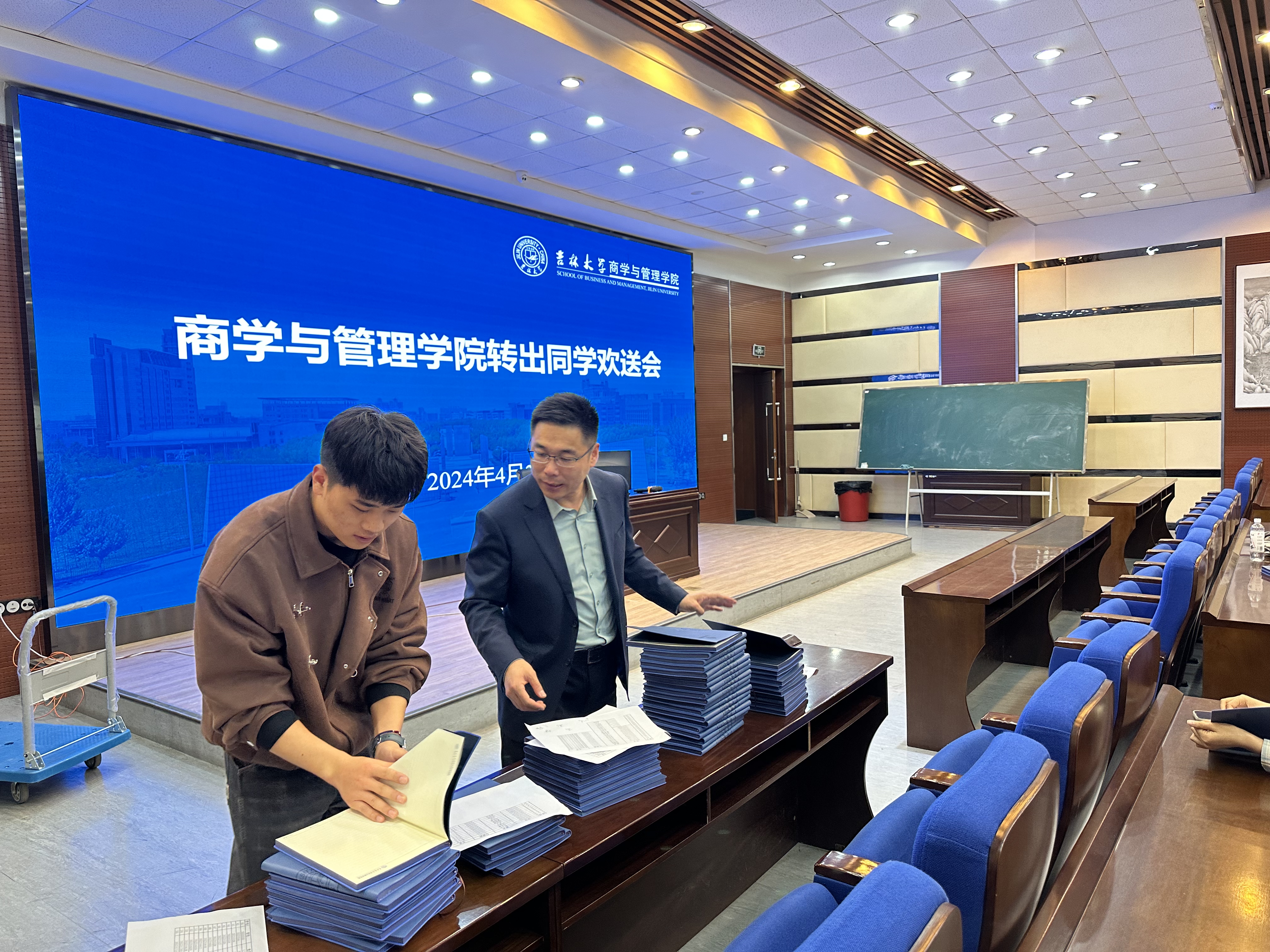 2024年4月23日上午,商学与管理学院举行了转出同学欢送会,大家一同相聚于东荣大厦B310,商学与管理学院党委副书记兼副院长李帅老师和2023级辅导员陈卓老师、罗小杰老师主持了本次活动。