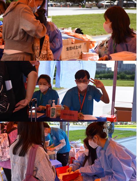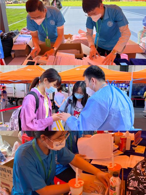 上午七时整,伴随着丝丝细雨,迎新志愿者们早早地来到报到处,在商管学院的蓝色帐篷下布置迎新工作所需的物件。由于昨天是新生到来的高峰期,大部分新生在昨天已经完成报到,所以今天现场的工作任务也相应减轻。即便如此,迎新志愿者们依然打起十二分的精神,以昂扬热情的面貌迎接新同学的到来,以认真负责的工作态度为新同学们解答困惑,测温、核对信息、收发材料等一系列工作同样有条不紊的进行着。
