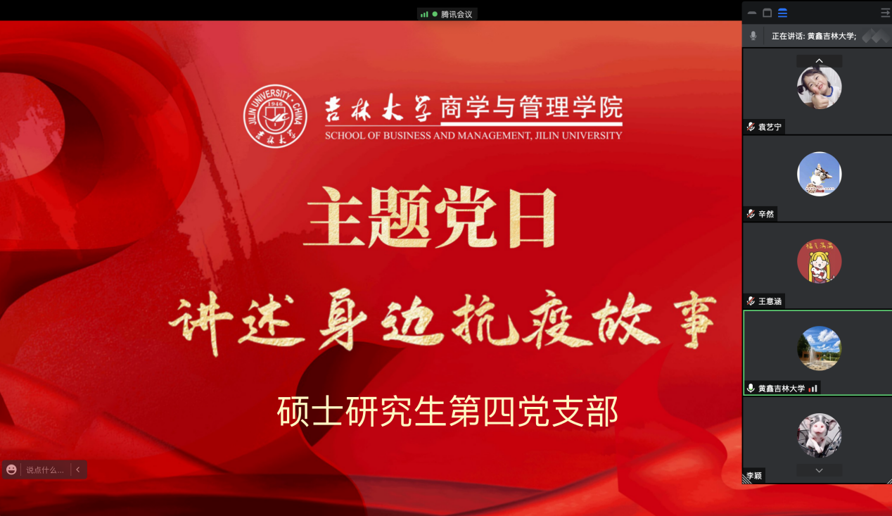 “讲述身边抗疫故事”主题党日活动开始,李惠萱同学先关心了支部党员最近的精神和学习工作情况,强调毕业答辩即将到来,让大家做好准备,放松心情,并预祝大家答辩顺利。