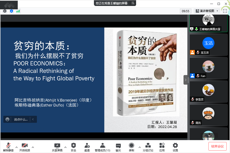 会议伊始,王馨凝同学围绕2019年诺贝尔经济学奖获得者阿比吉特·班纳吉[印]与艾丝特·杜芙若[法]合著的《贫困的本质》一书讨论分享了关于如何看待全球贫困的问题。随后,参会的龙玉洁、刘京、王逊、于婷等同学也纷纷从创业、日常生活、制度环境、非洲地区的贫困现状等方面分享了自己的感悟。