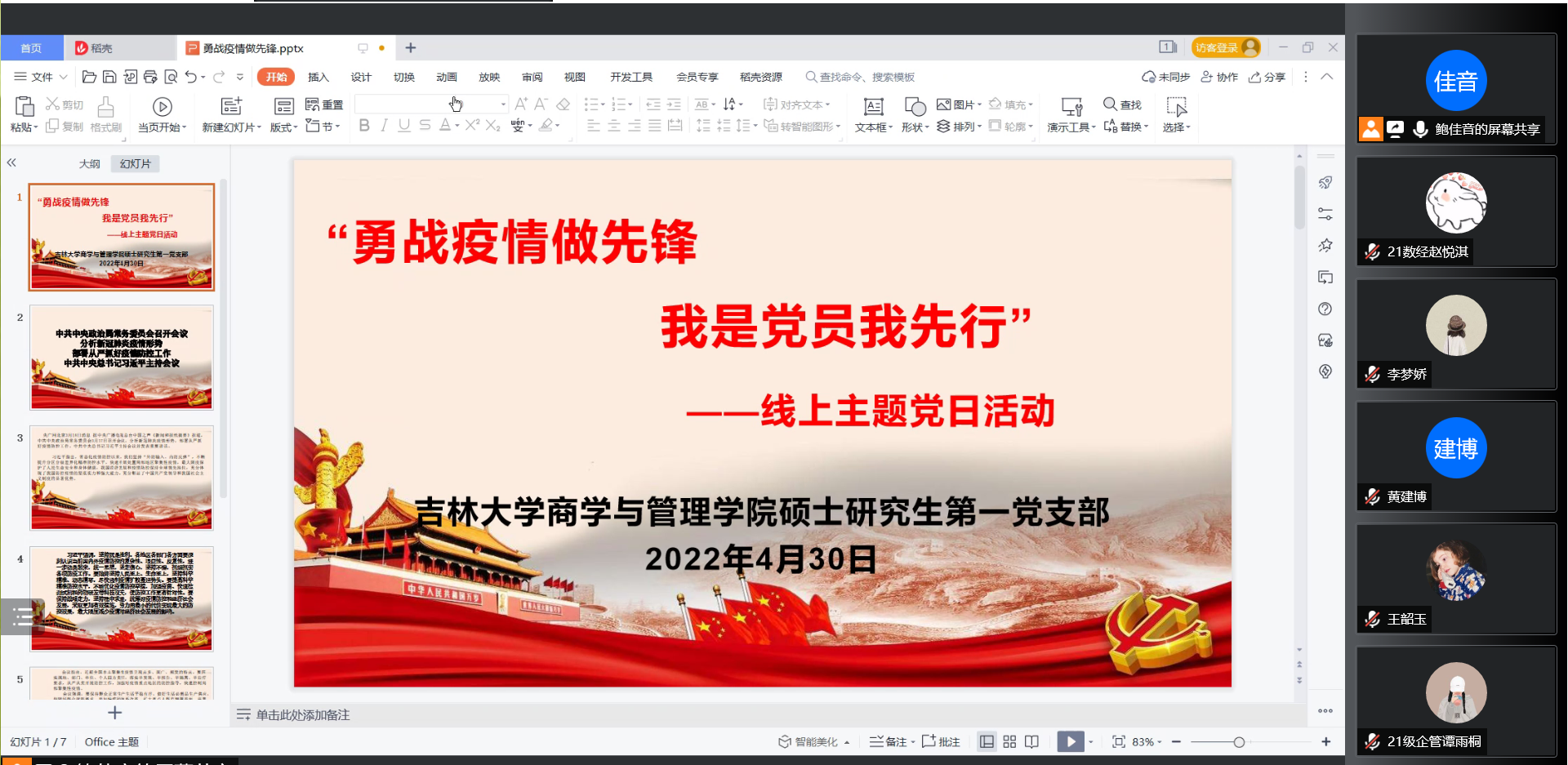 2022年4月30日,商学与管理学院硕士研究生第一党支部在线上开展以“勇战疫情做先锋 我是党员我先行”抗击疫情为主题的党日活动。商学与管理学院硕士研究生第一党支部全体党员参加了此次的线上活动。