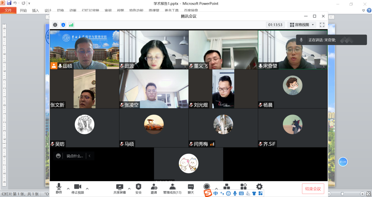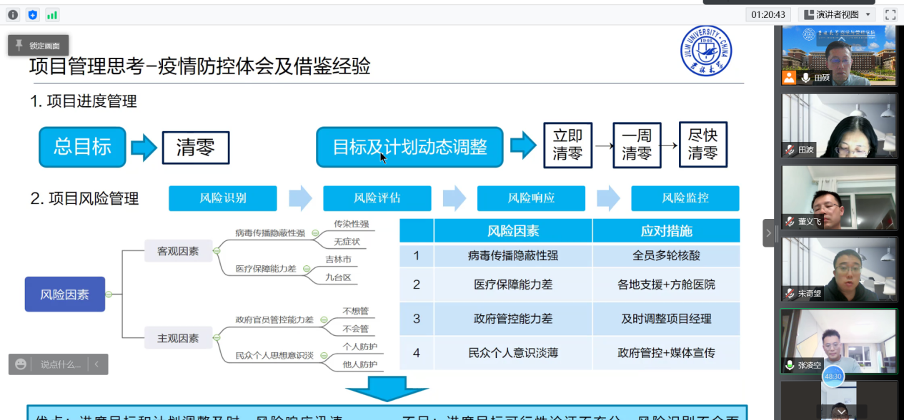 接下来,大家围绕应急预案准备、应急目标调整、决策流程改进等疫情应对决策与实施过程,运用项目进度管理、风险管理、应急管理等相关理论进行分析,参会学员踊跃发言、积极讨论,气氛热烈。随后,田硕教授则根据大家的发言进行了系统的总结与分析。田老师表示,项目管理不但可以应用于疫情的防控和处置过程,而且对抗疫期间的决策分析也有一定的帮助。他鼓励同学们要学以致用,将学到的理论知识灵活运用到生活的方方面面。会议最后,田老师对封校期间大家的学习和生活表示了关心和慰问,并叮嘱大家要积极配合学校防疫工作,调整良好的我心态,相信疫情终究会过去,春天一定会来临。