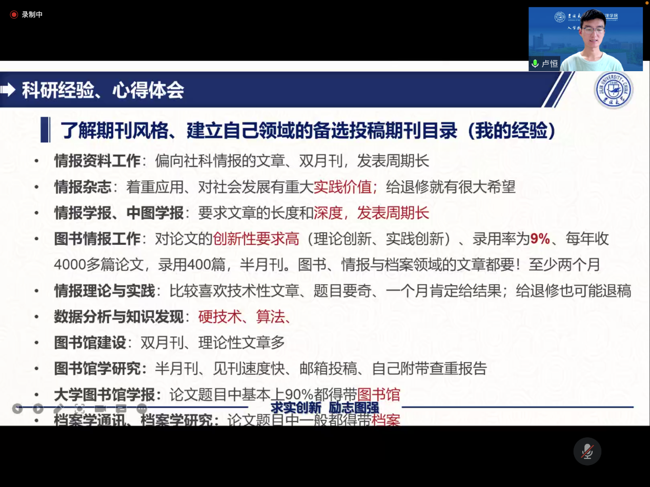 会议开始,裴月莹老师首先向大家简要介绍了卢恒学长,并对卢恒学长的到来表示热烈欢迎。随后卢恒学长开始分享,以自身硕博连读的经历为例子,讲述了自己如何在学术业绩成果和学生干部中相平衡。其次卢恒学长从三个视角分享自己的科研经验,分别是为什么写论文、论文是写出来的么以及如何撰写论文初稿与选择投稿期刊,其中重点讲述了如何撰写论文初稿以及如何将论文投稿。