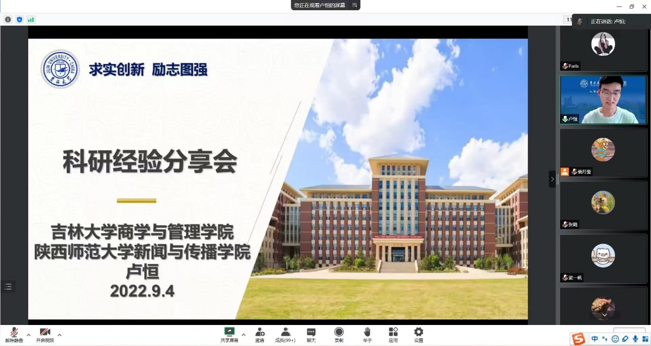 为了让同学们了解如何进行学术研究,营造一个学术氛围浓厚的环境,9月4日,我院邀请了2022级优秀博士毕业生卢恒,于线上开展吉林大学十佳博士研究生学习经验分享会,向同学们分享自身的科研经验与心得体会。会议由裴月莹老师主持,商学与管理学院全体新生参会。