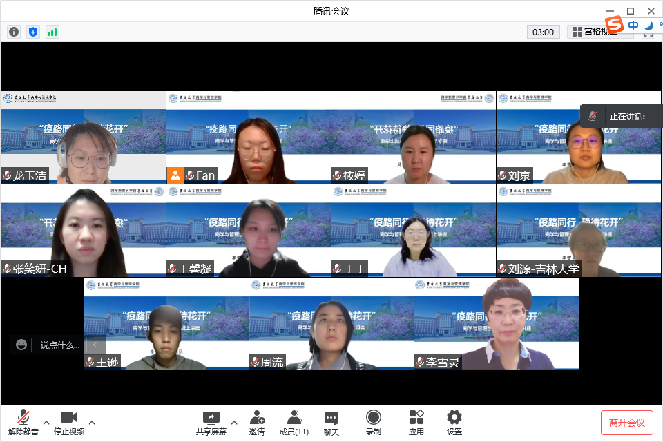 为积极响应学校号召,让同学们在做好疫情防护措施的同时安心开展课程学习和学术研究工作,吉林大学商学与管理学院组织开展“疫路同行,静待花开”研究生导师导学主题活动。4月4日晚,李雪灵教授课题组通过腾讯会议组织召开了学术研讨会,刘京、龙玉洁、张笑妍等课题组全体成员参加会议。