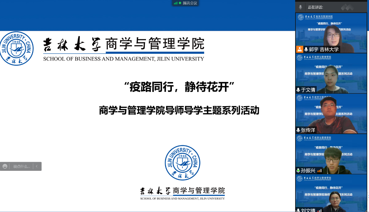 为加强学校封闭、封寝期间研究生学术交流工作,增强师生抗疫的必胜信念,发挥导师对研究生学习、生活与心理的引领与疏导作用。2022年3月20日晚,由吉林大学商学与管理学院信息管理系郭宇副教授组织开展了研究生导师导学线上研讨交流会议。本次会议由郭宇副教授主持指导,课题组硕士研究生刘文晴、孙振兴、于文倩及张传洋共同参加。