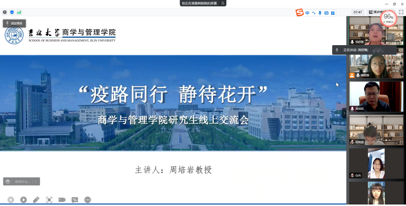 为积极响应学校号召,引导学生树立抗疫必胜信念,进一步安心开展学术研究工作,吉林大学商学与管理学院组织开展“疫路同行,静待花开”研究生导师导学主题活动。3月18日晚,商学与管理学院会计系周培岩教授组织召开线上交流会议,博士研究生周舒雅、刘炫伶,硕士研究生韩晗晗、程晓晨及本科生白兵共同参会。