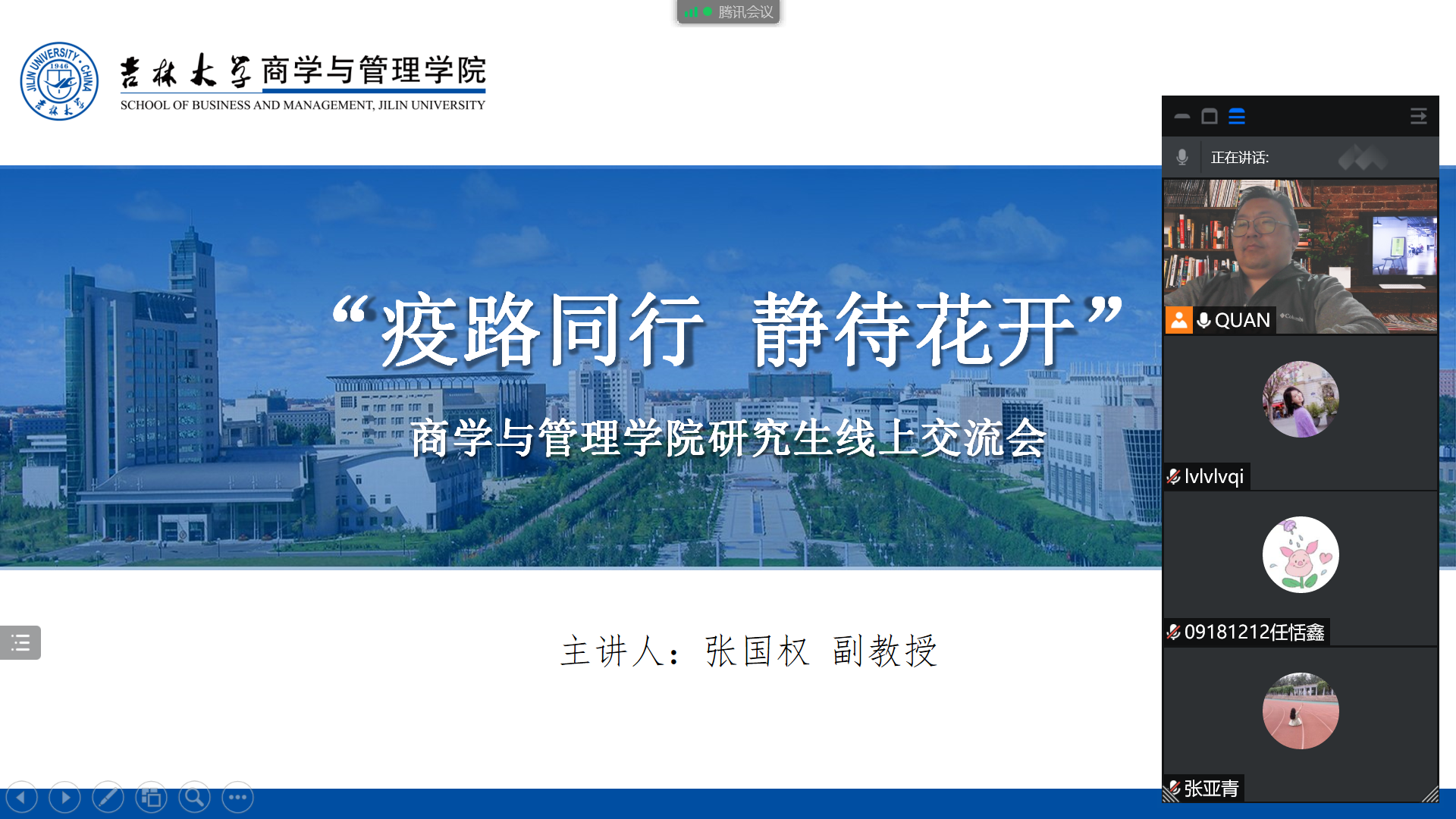 疫情之下为了鼓励研究生对学术前沿进行不断探索,加强封闭期间得学习科研管理,加深导师对研究生得关怀和指导,商学与管理学院组织开展“疫路同行,静待花开”研究生导师导学活动。2022年3月17日晚,商学与管理学院研究生导师张国权老师于线上以腾讯会议的形式组织开展了每周例行组会,组内同学吕琦、张亚青和任恬馨共同参加。