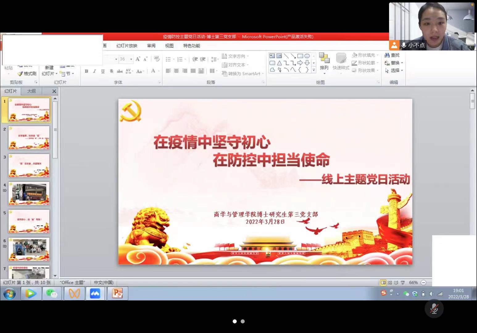 2022年3月28日晚,商学与管理学院博士研究生第三党支部在线上腾讯会议开展了以“在疫情中坚守初心,在防控中担当使命”为主题的党日活动,鼓励支部党员投身于抗击疫情的工作中,坚守初心共同抗疫。
