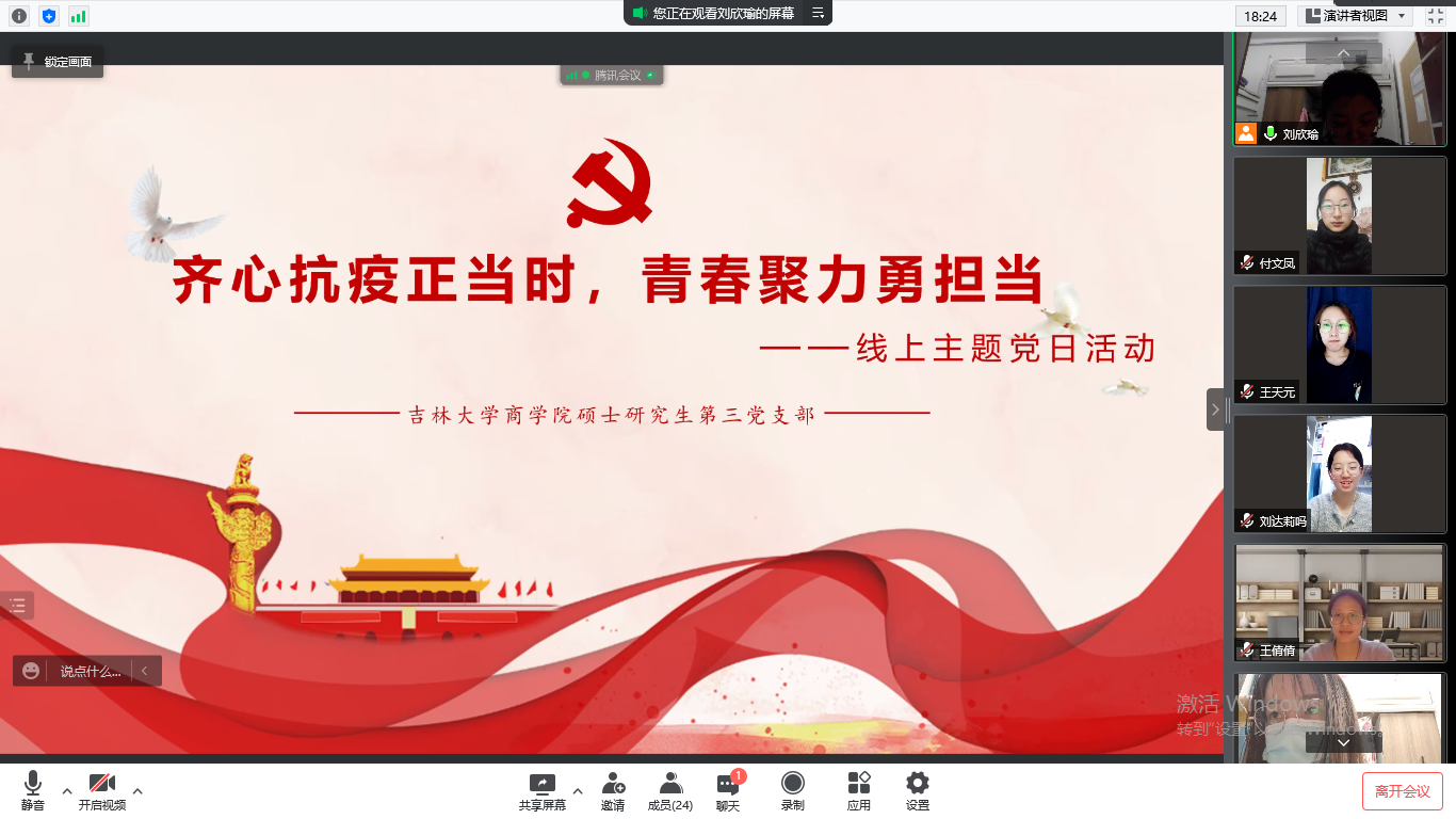 进入3月,新冠肺炎疫情波及我国多个省份,疫情防控面临新的挑战。硕士研究生第三党支部于3月27日在线上腾讯会议开展了以“齐心抗疫正当时,青春聚力勇担当”为主题的党日活动,鼓励支部党员齐心抗疫。