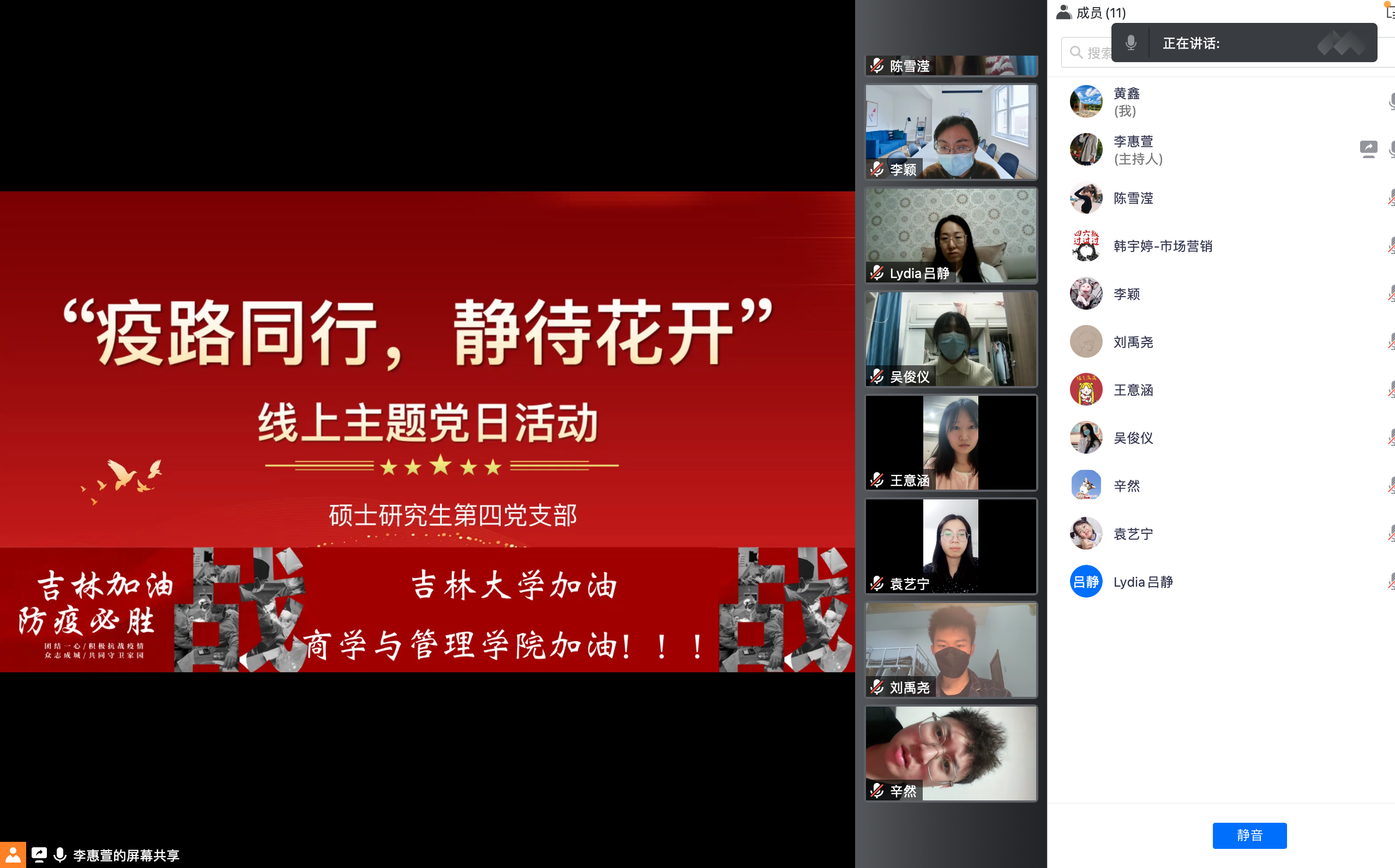 吉林省新冠肺炎疫情防控形式日益严峻,这个三月,全体吉大人以敢战必胜的勇气与决心,积极夺取疫情防控阻击战的全面胜利。为调动党员及党员干部抗疫的积极性,增强党员们带领群众打赢抗疫战的信心,商学与管理学院硕士研究生第四党支部于3月24日19:00,在线上腾讯会议开展了以“疫路同行 静待花开”为主题的党日活动。支部全体党员及支部参与志愿者工作的积极分子参与了此次活动。