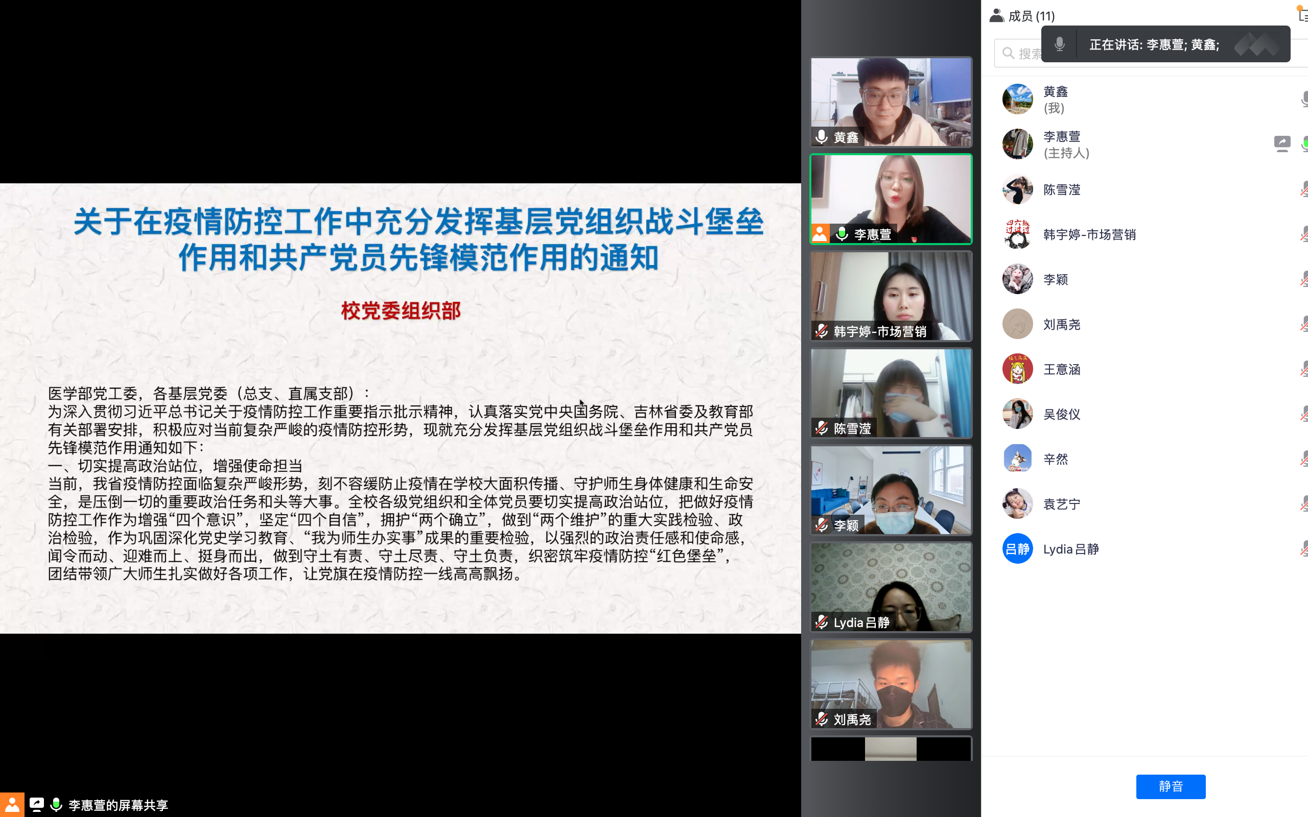 首先,为深入贯彻习近平总书记关于疫情防控工作重要指示批示精神,认真落实党中央国务院、吉林省委及教育部有关部署安排,积极应对当前复杂严峻的疫情防控形势,充分发挥基层党组织战斗堡垒作用和共产党员先锋模范作用,支部书记李惠萱同志宣读了由吉林大学党委组织部发布的关于在疫情防控工作中充分发挥基层党组织战斗堡垒作用和共产党员先锋模范作用的通知。号召支部党员切实提高政治站位,增强使命担当,切实发挥先锋模范,突出示范带动,同时也鼓励激励支部积极分子在疫情防控期间做正向表率。紧接着,支部书记关心了校内外的支部党员的封闭情况,日常生活情况以及学习情况,了解到有一位党员在外地未在家但是也十分注重防疫,有两位党员在校内封闭一切安好,其余党员均在家里,生活物资尚且够用。