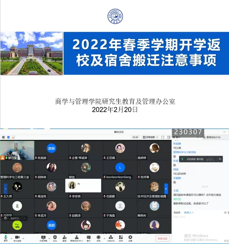 为了进一步明确春季学期特殊批次研究生返校工作和研究生公寓搬迁工作安排,商学与管理学院于2022年2月20日上午召开线上研究生管理工作会议,参加会议的有学院党委副书记马腾老师、研究生辅导员裴月莹老师和全体涉及公寓搬迁工作研究生,会议由裴月莹老师主持。