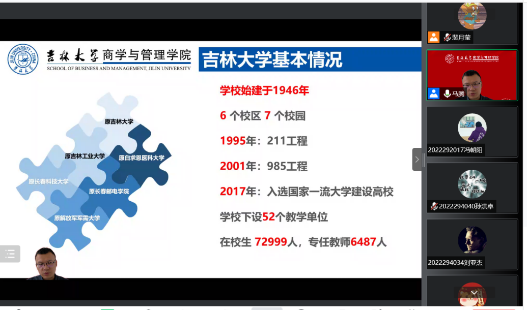 紧接着,马腾老师为大家介绍了学校和学院的基本情况以及学院成立以来的工作开展情况。马腾老师表示,商学与管理学院的合并既是资源的整合,也是利好的趋势。学院重视基层党组织工作,积极开展各类思政主题教育引领活动,通过制作各类思政教育视频,举办心理、就业、学术等多类型讲座和沙龙活动,聚焦学生的思想政治教育。