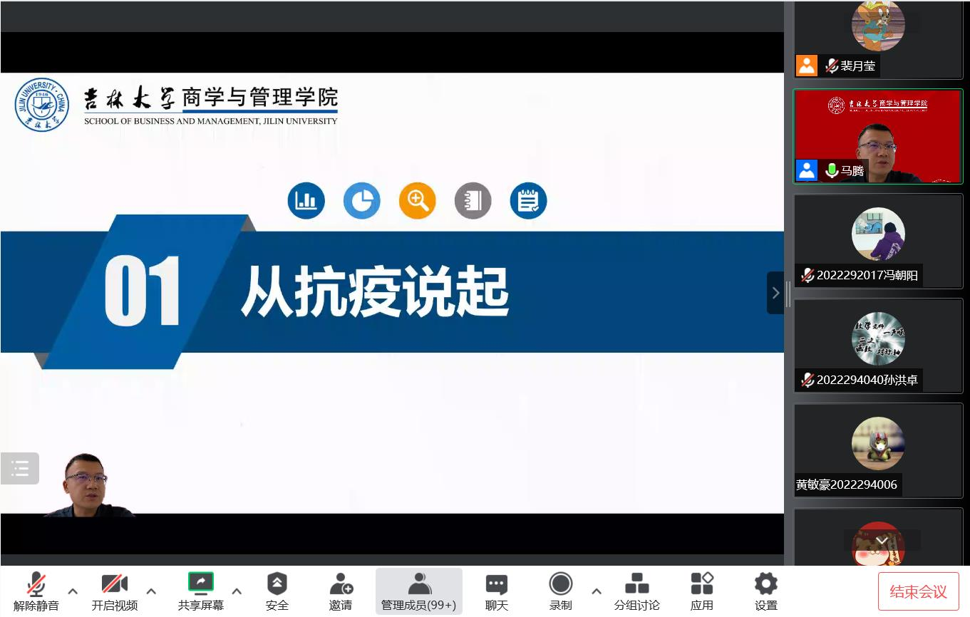 会议伊始,马腾老师对全体2022级研究生新生的到来表示热烈欢迎。随后,马腾老师从上半年的抗疫经历说起,用详实的数据和鲜活的案例为大家讲述了抗疫期间我们身边发生的真实故事,包括驻楼老师和学生志愿者的日常工作等。大家不仅从中感受到了抗疫的艰辛,还有老师和同学们的温暖与担当。马腾老师表示,希望大家可以将抗疫期间商管学子的青年担当和良好品格继续学习和传承下去。