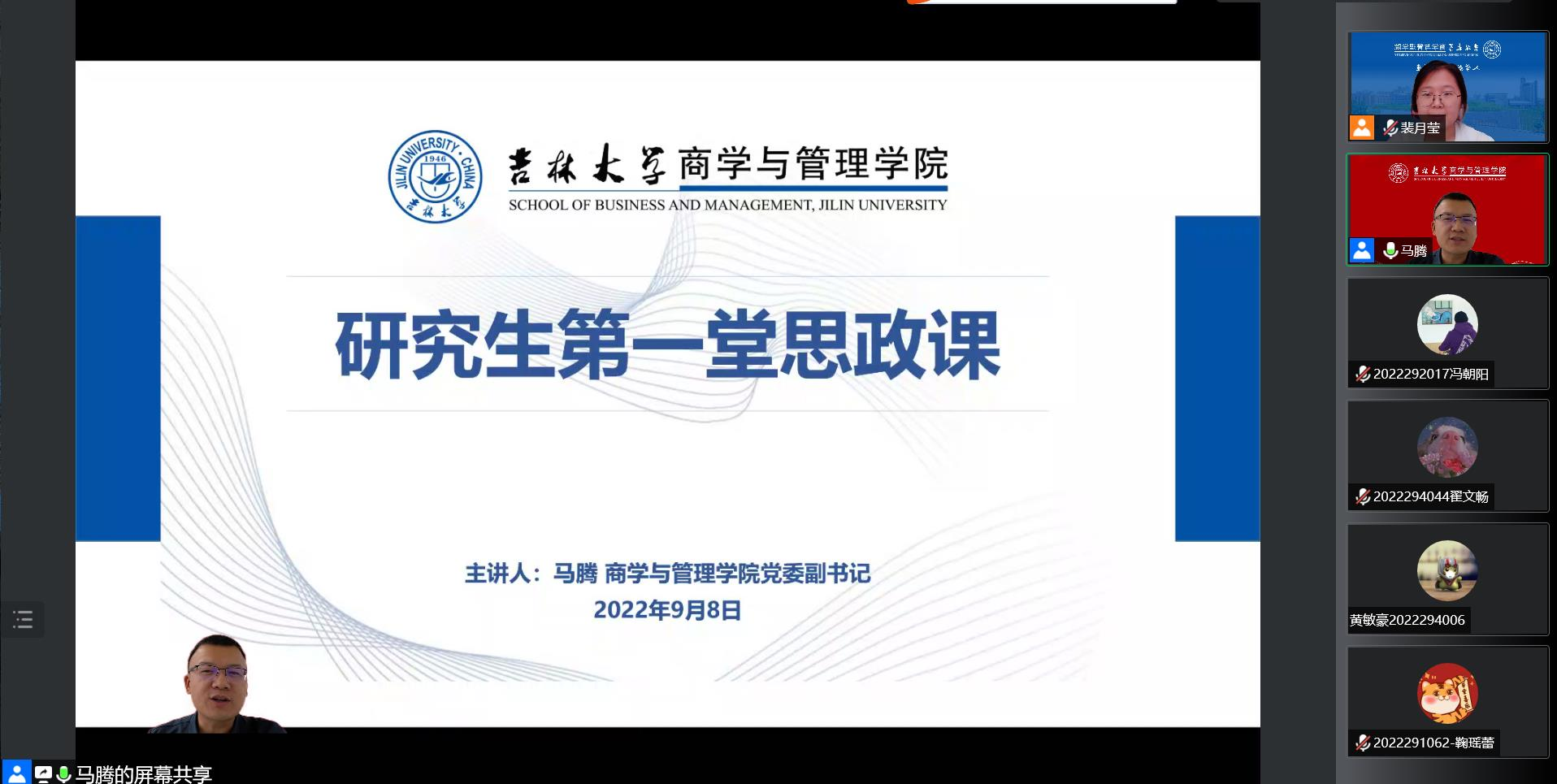 为加强2022级研究生新生思想政治建设,帮助新生尽快适应新的学习阶段,2022年9月8日,商学与管理学院党委副书记马腾老师于线上为新生主讲第一堂思政课,研究生辅导员裴月莹老师主持会议,全体2022级研究生参会。